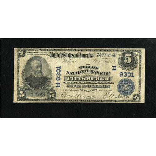 <B>Pittsburgh, PA</B></I> - $5 1902 Plain Back Fr. 598 <B>The Mellon NB</B></I> Ch. # (E)6301<BR> A few pinholes are noticed on this <B>Very Good</B></I> note from a popular bank.<BR><BR><b>Shipping:</b> Coins & Currency (<a target="_blank" href="http://www.heritageauctions.com/common/shipping.php">view shipping information</a>)