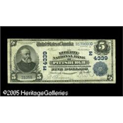<B>Pittsburgh, PA</B></I> - $5 1902 Plain Back Fr. 601 <B>The Liberty NB </B></I> Ch. # (E)4339<BR>A more challenging big city bank, which closed its doors in 1923 and has bequeathed a legacy of only nine Large survivors to the present day collecting fraternity.<B>Fine-Very Fine.</B></I> Lot:16972