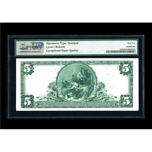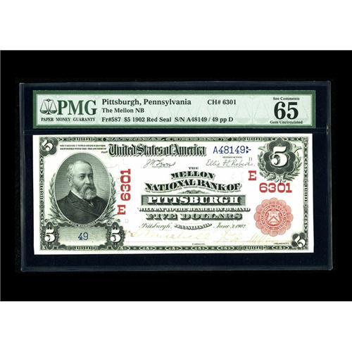 <B>Pittsburgh, PA</B></I> - $5 1902 Red Seal Fr. 587 <B>The Mellon NB</B></I> Ch. # (E)6301<BR>A nicely centered Red Seal bearing double digit serial number 49 which has been encapsulated and assigned the grade of <B>PMG Gem Uncirculated 65EPQ.</B></I> The stamped signature of A.W. Mellon as President is clearly evident.<BR><I>From The Bill and Kathy Stella Currency Collection</B></I><BR><BR><b>Shipping:</b> Coin/Currency (<a target="_blank" href="http://www.heritageauctions.com/common/shipping.php">view shipping information</a>)