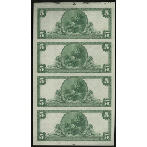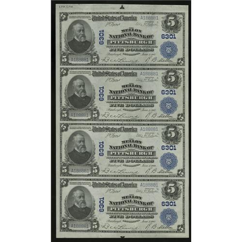 <B>Pittsburgh, PA</B></I> - $5-$5-$5-$5 1902 Plain Back Fr. 598 <B>The Mellon NB</B></I> Ch. # 6301 Uncut Sheet<BR>This is a very interesting uncut sheet. First, the printing of this denomination was so large for this bank that a serial number prefix letter was necessary and second, this sheet has palindrome serial number A188881. This makes only the fourth large sheet known on this bank. <B>Choice Crisp Uncirculated.</B></I><BR><BR><b>Shipping:</b> Coin/Currency (<a target="_blank" href="http://www.heritageauctions.com/common/shipping.php">view shipping information</a>)