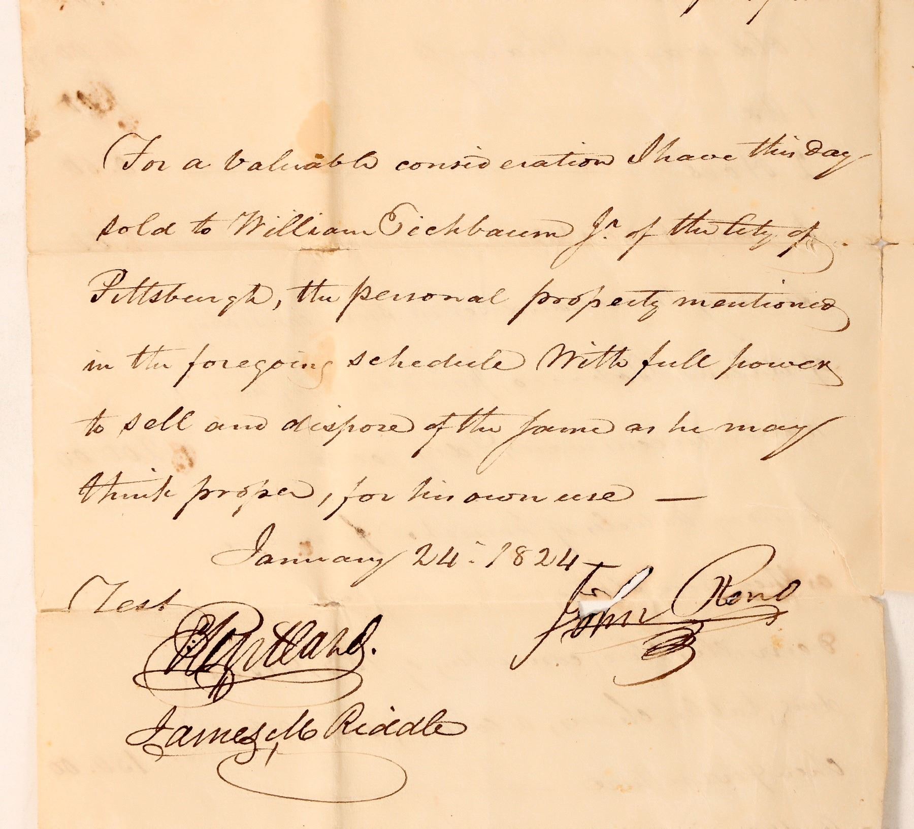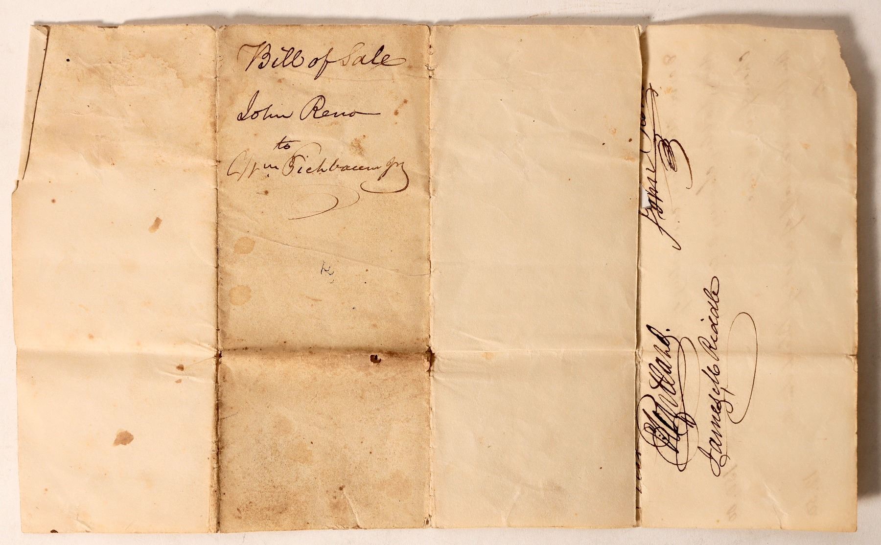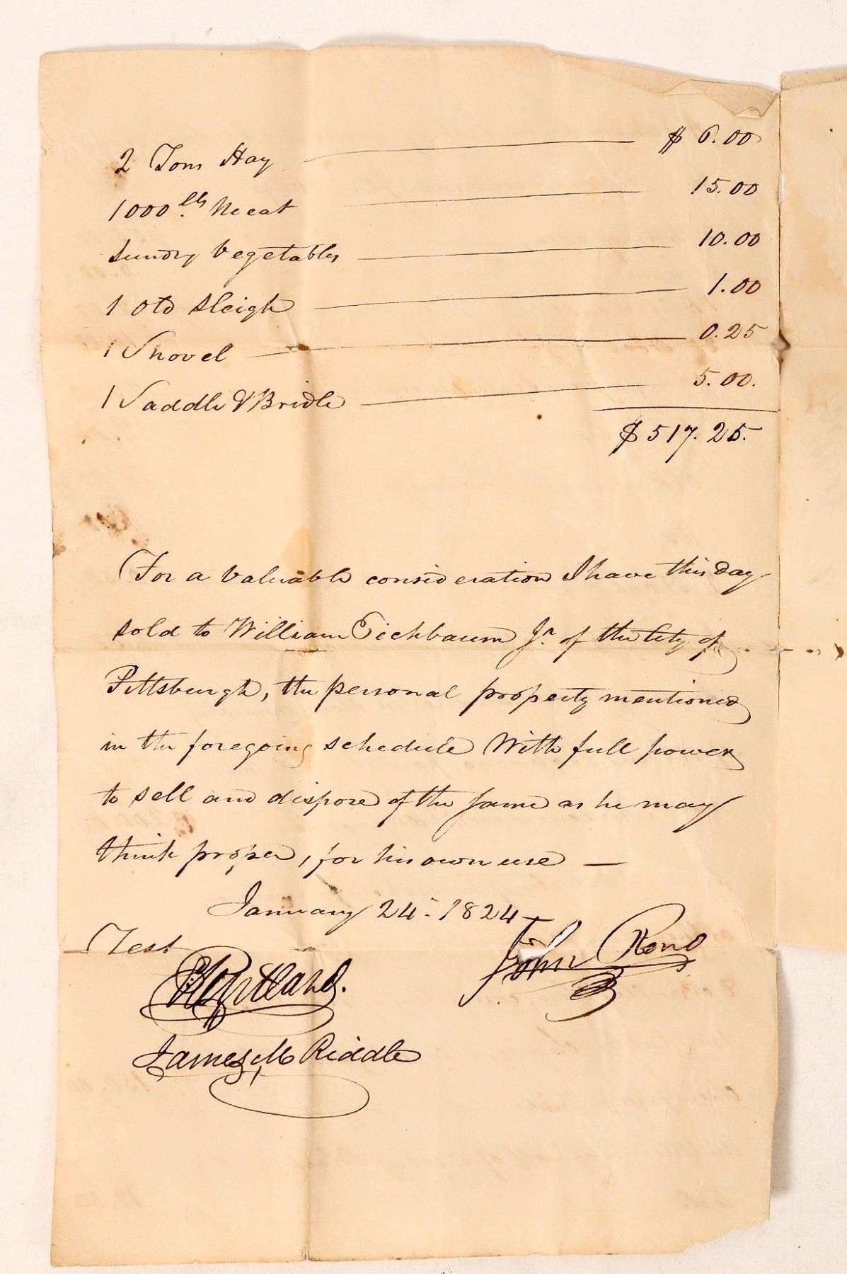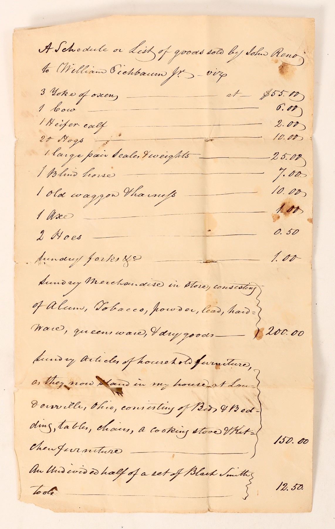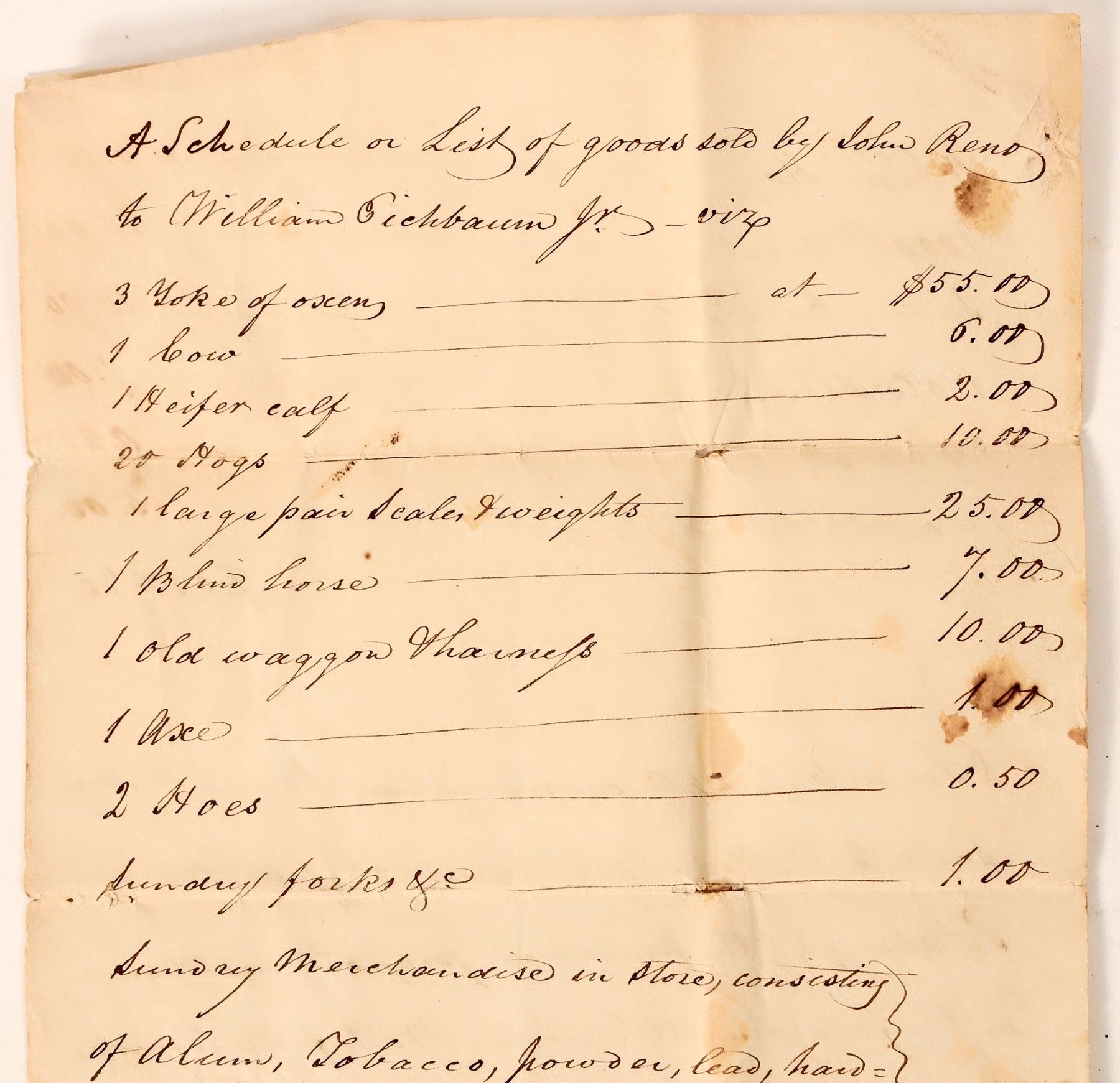 An 1824 schedule of goods sold by John Reno to William Eichbaum in Pittsburgh, Pennsylvania. The handwritten schedule includes a list of items and corresponding prices, including tools for farming and smithing, vehicles, items of household furniture, and livestock including 5 cows, 25 hogs, and "1 blind horse". John Reno has no apparent relation to Jesse Reno.