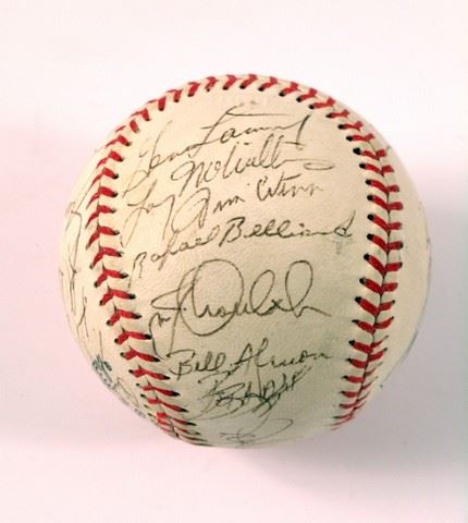 Pittsburgh Pirates late 1980's and early 1990's autographed baseball with the signatures of Manager Jim Leyland , R.J. Reynolds, Rafael Belliard, Bob Kipper, Stan Belinda, Bill Almon, Ray Krawczyk, Bill Landrum, Don Robinson, Mike Bielecki, Larry McWilliams, Rick Reuschel, Jim Morrison, and many more.