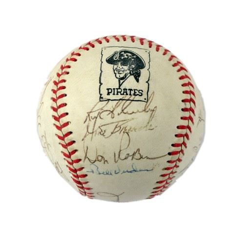 Pittsburgh Pirates late 1980's and early 1990's autographed baseball with the signatures of Manager Jim Leyland , R.J. Reynolds, Rafael Belliard, Bob Kipper, Stan Belinda, Bill Almon, Ray Krawczyk, Bill Landrum, Don Robinson, Mike Bielecki, Larry McWilliams, Rick Reuschel, Jim Morrison, and many more.