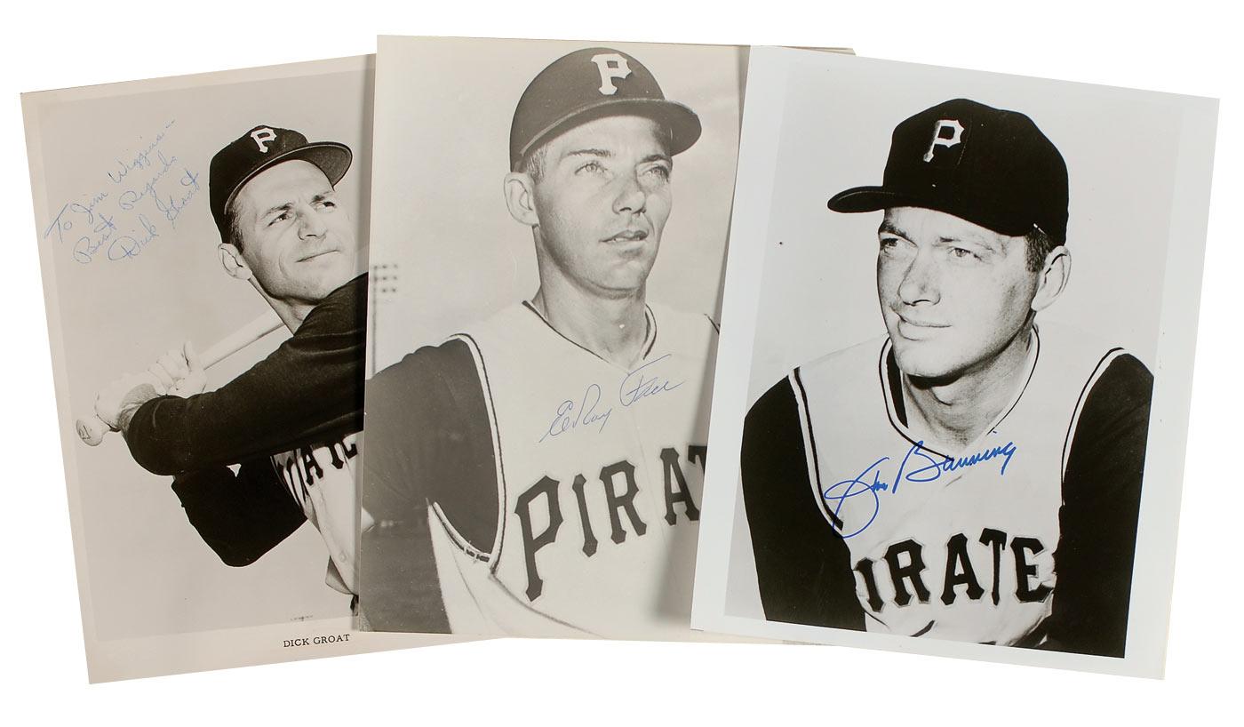 Three glossy 8 x 10 photos, each signed in felt tip or ballpoint by the respective Pirate pictured. Signers are: Dick Groat (ins), Jim Bunning, and Elroy Face. Creasing to Groat’s photo, otherwise fine condition.