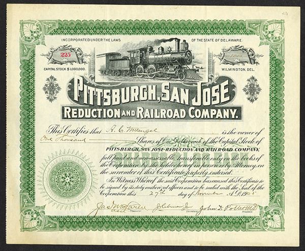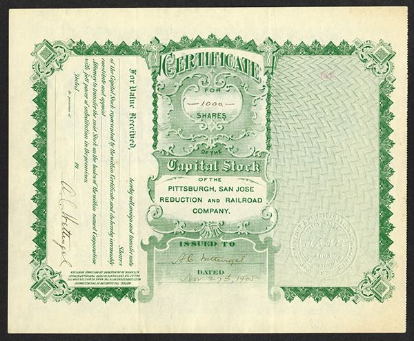 Texas (inc. in Delaware), 1000 Shares, I/U, Black on green border and underprint, Locomotive L-R on top middle. rare railroad. VF condition. All of the buildings and railroad property burned up and all of the tracks torn up by Pancho Villa during the revolution. (From a Texas Gentleman's Collection).