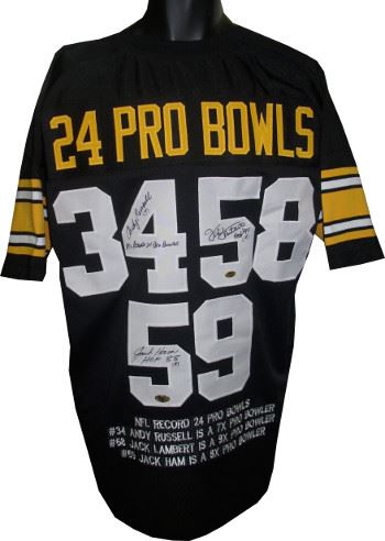Andy Russell wore number 34 as an outside linebacker for the Pittsburgh Steelers in 1963 and from 1966-1976. He was an early member of Pittsburgh's famed Steel Curtain defense, and was named the Steelers' MVP in 1971. Andy was selected to 7 Pro Bowls. Jack Lambert was known for the hard hits he delivered to members of the opposing team. Lambert prided himself on his ability to hit hard and intimidate the opposition. He was a 9 Time Pro Bowl selection and 4 time Super Bowl champion. Jack Ham was the Pittsburgh Steelers second-round draft pick in the 1971 NFL Draft out of Penn State, where he was an All-American. He won the starting left linebacker job as a rookie. He was First-team All-Pro six years and was named to eight straight Pro Bowls. Ham was a member of 4 Super Bowl winning teams during his 12 year career. This Pittsburgh Steelers unlicensed custom-prostyle jersey with Embroidered Stats and with twill stitched nameplate and numbers is signed by Andy Russell, Jack Lambert, and Jack Ham all with there number of Pro Bowl Appearances inscription and with NFL Record 24 Pro Bowls. Lambert/MAB Holograms and Certificate of Authenticity from Athlon Sports.