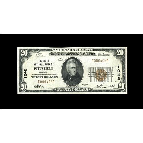 <B>Pittsfield, IL</B></I> - $20 1929 Ty. 1 <B>The First NB</B></I> Ch. # 1042<BR>But for a tiny bent corner tip we'd have been tempted to confer Gem honors on this well centered <B>Choice Crisp Uncirculated</B></I> example from the only bank to issue in this Pike County community, which was the site of one of the Lincoln-Douglas debates.