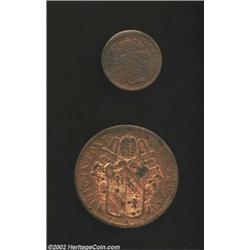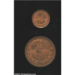Pius IX 1/2 Baiocco 1850R, KM1355, Choice lustrous UNC and 5 Baiocchi 1851R KM1356 Lustrous UNC, some spotting. A nice pair of high grade Vatican bronze coins. 2 coins Important notice: We expect to be auctioning lots at the rate of 200-250 per hour. Sometimes eBay Premier live bid software cannot keep up with that pace, so we strongly recommend that you place a realistic proxy bid now as insurance to avoid disappointment. Also please note that all Heritage/CAA lots purchased through eBay Premier carry a 20% Buyer's Premium. Please make sure you read the Terms and Conditions.