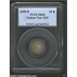 Pius IX 10 baiocchi 1858-B year XIII, Tiara and crossed keys over arms/Date and value in wreath, Ber-3316, KM-172a, MS64 PCGS. A very scare date. Important notice: We expect to be auctioning lots at the rate of 200-250 per hour. Sometimes eBay Premier live bid software cannot keep up with that pace, so we strongly recommend that you place a realistic proxy bid now as insurance to avoid disappointment. Also please note that all Heritage/CAA lots purchased through eBay Premier carry a 20% Buyer's Premium. Please make sure you read the Terms and Conditions.