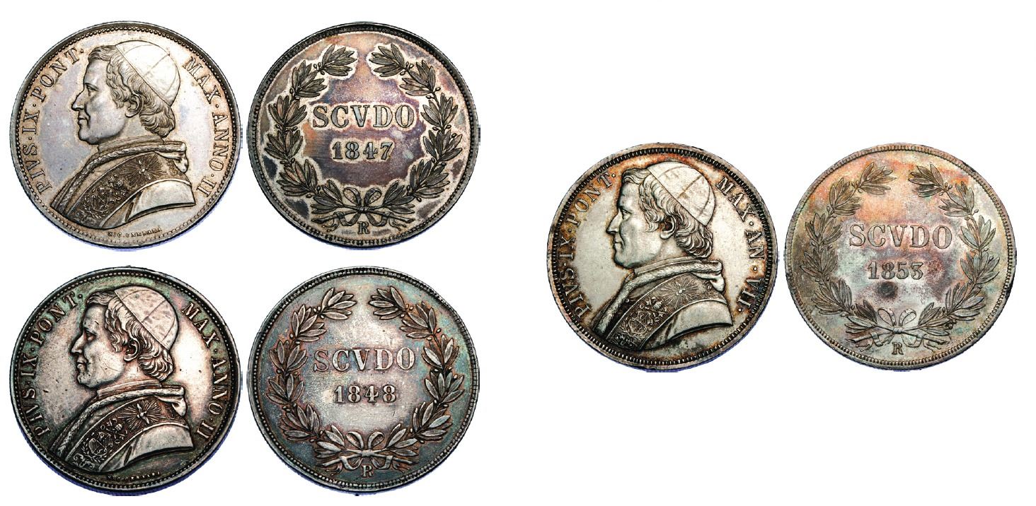 Pius IX 1846-1870 Lot de 3 monnaies en TTB-SUP Scudo, Roma, 1847, AN II, AG 26.9 g. / MIR 3117/4, Munt. 9a, Pag. 310 Scudo, Roma, 1848, AN II, AG 26.8 g. / MIR 3117/6, Munt. 9b, Pag. 311 Scudo, Roma, 1853, AN VII, AG 26.8 g. / MIR 3137/2, Munt. 10, Pag. 394