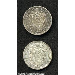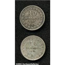 <B>Pius IX pair as follows:</B></I> KM1342b, 10 Baiocchi 1861R, VF; and a KM1342c, 10 Baiocchi 1865R, VF. 2 coins <BR><BR><B>Important notice:</B> Heritage usually auctions material at the rate of 200-250 lots per hour. On some occasions eBay Live bid software or the Internet may not be able to keep up with the pace of the auction. We recommend placing a realistic absentee bid now as insurance to avoid disappointment. Occasionally the auctioneer may eliminate or reject an eBay Live bid, and the auctioneer may also reopen a lot after the close of the eBay live bidding (usually because we missed an audience bid), and may reject your bid even if it shows you as the winning bidder. By bidding via eBay Live, you agree that Heritage may award the lot to another bidder at its sole discretion under the circumstances described above or any other reasonable circumstances. Since eBay bids are not shown to us until we open the lot on the floor, we treat those bids just like floor bids. In most cases the floor responds before the eBay bid is presented to us, due to Internet lag time, so for consistency we have made it a policy that floor bids are always considered first over tie eBay live bids. Also please note that all Heritage lots purchased through eBay Live carry a 20% Buyer's Premium. Please make sure you read the Terms and Conditions before you bid.