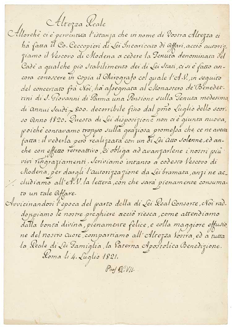 Born Count Barnaba Niccolò Maria Luigi Chiaramonti, Pope from 1800-1823. LS, in Italian, signed “Pius PP. VII,” one page, 8.75 x 12.5, July 4, 1821. Neatly penned letter to Francesco IV, the Duke of Modena, reads, in part: “We received news that you assigned a pension of 800 shields yearly to the Monastery of Benedictine of Parma in exchange of a property called Cadè starting from July of last year. We thank you for your action and we authorize the Bishop of Modena to complete the transaction. In the approaching of the delivery of Your Royal bride we double our prayers and send to Your Highness and your Royal Family the Paternal Apostolic Blessing.” Intersecting folds, one through a single letter of signature, a bit of light toning, and a few creases, otherwise fine condition. Pre-certified PSA/DNA and RRAuction COA.