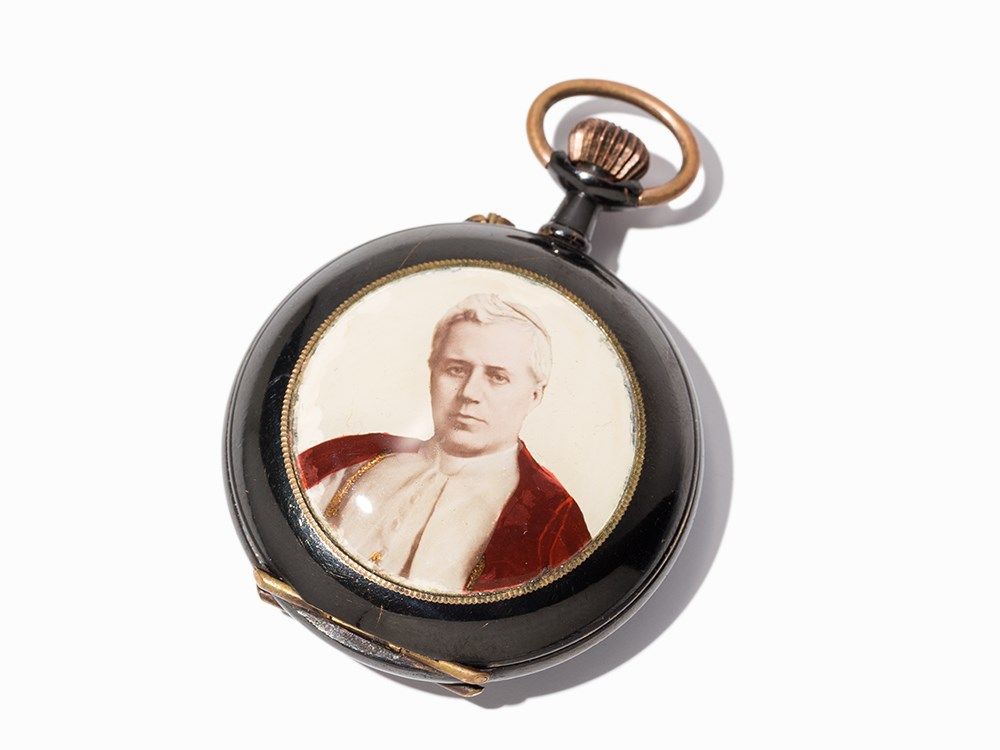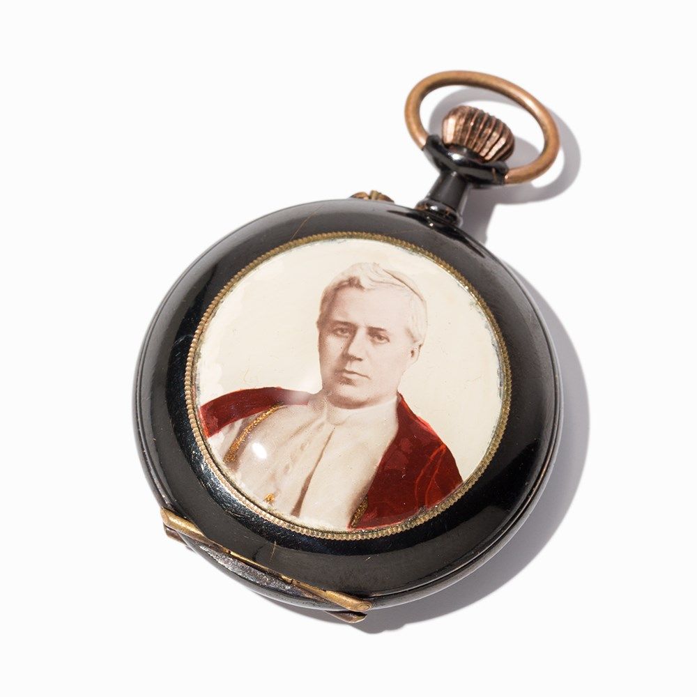 The present pocket watch dates from circa 1900 and shows an enameled portrait of Pope Pius X. It has a crown wind movement and displays the hour and minute. The watchcase is made ??of blued brass, and the white enamel dial is fitted with Roman numerals and gilt Louis XV hands.