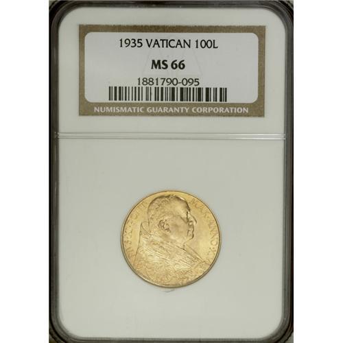 <B>Pius XI gold 100 Lire 1935,</B></I> KM-9, MS66 NGC, another satiny jewel. Just 2,015 minted. Few remain so fine!<BR><BR><b>Shipping:</b> Coin/Currency (<a target="_blank" href="http://www.heritageauctions.com/common/shipping.php">view shipping information</a>)