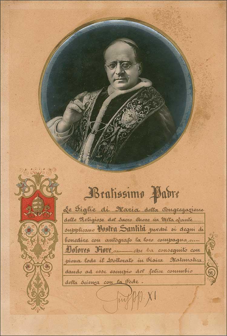 Pope (1857-1939), born Ambrogio Damiano Achille Ratti, who ascended the papal throne in 1922 and issued encyclicals condemning communism, fascism, and racism. Apostolic blessing, in Italian signed “Pius pp. XI,” one page, 9.75 x 14.5,no date. A handsome, hand-tinted apostolic blessing for Dolores Fiore, featuring an ornate hand illumintation and an affixed circular photo of Pius. In very good condition, with light overall toning, scattered foxing and soiling, and silvering to photo. Pre-certified PSA/DNA and RRAuction COA.