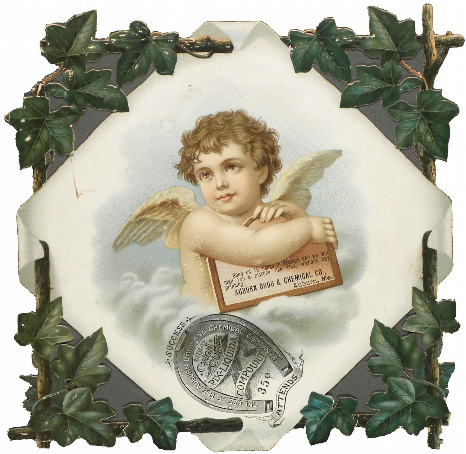 Pix-Liquida Compound Embossed Die Cut Sign. Depicting cherub with ivy border. Some very minor staining and slight paper loss on a couple corners. 9 X 9 1/4 inches image only.