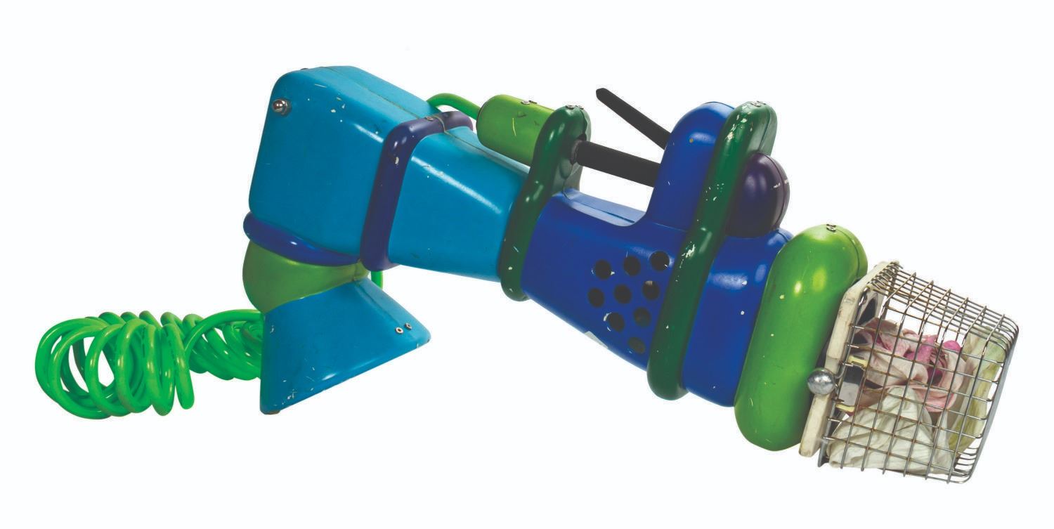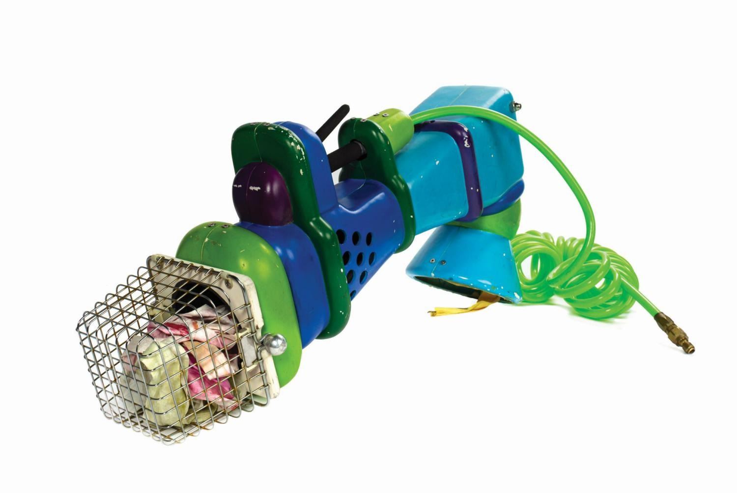 (Disneyland, c.2000s) A compressed air streamer gun used by Pixar walkaround characters in the Pixar Play Parade. It is constructed of brightly colored plastic, metal, rubber insulated hosing, and other repurposed components. When the hand trigger is depressed, compressed air shoots streamers out above the crowd. Measuring approximately 30.75"x14" and 7.5" deep, the piece is in very good park-used condition with some scuffing, scratching, surface wear, dings, and spot paint loss. The mechanical functionality has not been tested.
