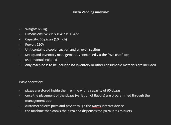 Pizza Vending Machine - 60 Pizza Capacity -Weights 650kg - 71" W x 41" D x 94.5" T -Info in Last Picture