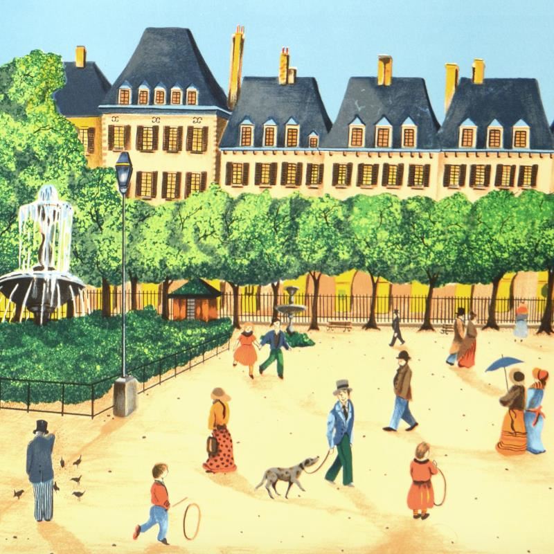 "Place" is a limited edition lithograph on paper by Heine, numbered and hand signed by the artist. Measures approx. 30" x 22" (border), 26" x 18" (image).
