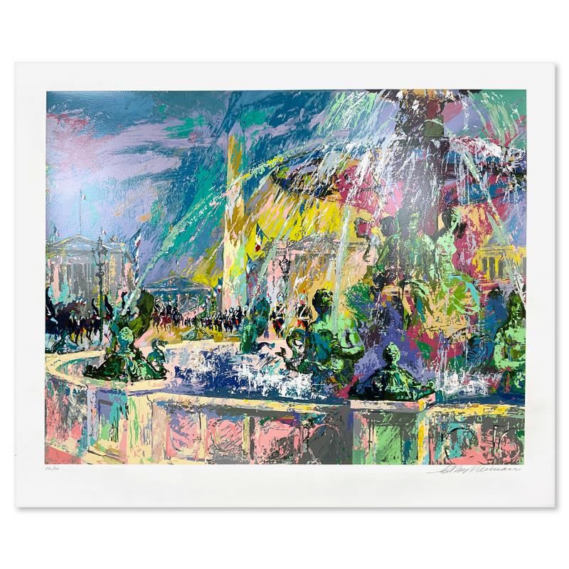 "Place de la Concord" is a limited edition serigraph on paper by LeRoy Neiman (1921-2012), numbered 266/350 and hand signed by the artist. Includes Letter of Authenticity. Measures approx. 41.5" x 35" (border), 35.5" x 28" (image). Due to the age of this piece there are minor creases in the white border area that will be concealed when the piece is framed.