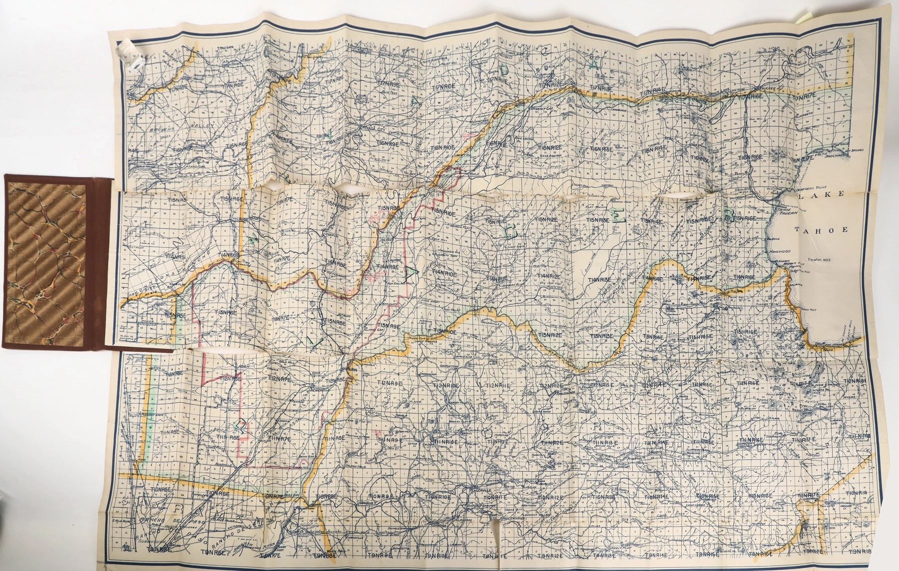 Lot of (2). Item 1 is a circa 1914 Placer County foldout color map. Sold by A.C. McKenzie of San Francisco, this hardcover book holds a full foldout graduated map with grid squares. Measuring 39"x28" when folded out, there is major age-tearing at the folds. The booklet measures 8.75"x5" when fully folded and closed. Condition is fair. Item 2 is an Auburn city map, "The Sierra Gateway," and guide, illustrated by the Chamber of Commerce. Neat group.