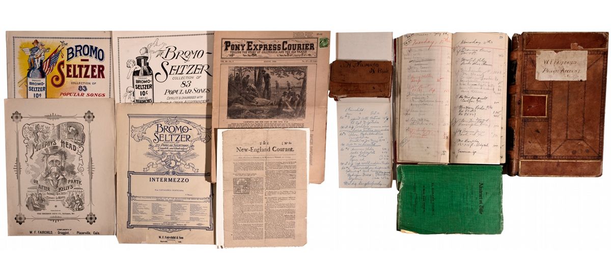 A collection of ledgers, prescription records, sheet music and other documents related to Placerville druggist, W.F. Fairchild. Included is a notebook owned by former employee J.H. Plumado, a notebook containing several handwritten prescription formulas and a large ledger that has written out recipes in the first few pages. Also included in the lot is a private account book for the business with the earliest entry dated November, 1881 and the last entry dated January, 1892. There is a page from the New England Courant dated Feb. 11, 1723 and 7 editions of the Pony Express Courier fro 1936-37. Also, 5 pieces of sheet music, a complimentary give-away by the pharmacy. Titles include, Starlight Polka, Intermezzo, My Sweetheart at the Door, Hail Columbia, Murphy's Head or, After Kelly's Party. This a nice record from what appeared to be a thriving business in old Hangtown. -59733