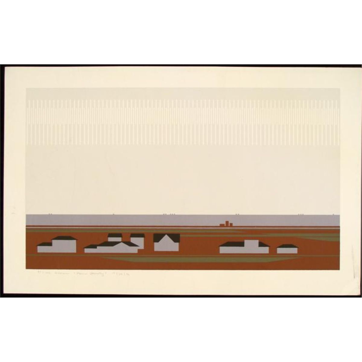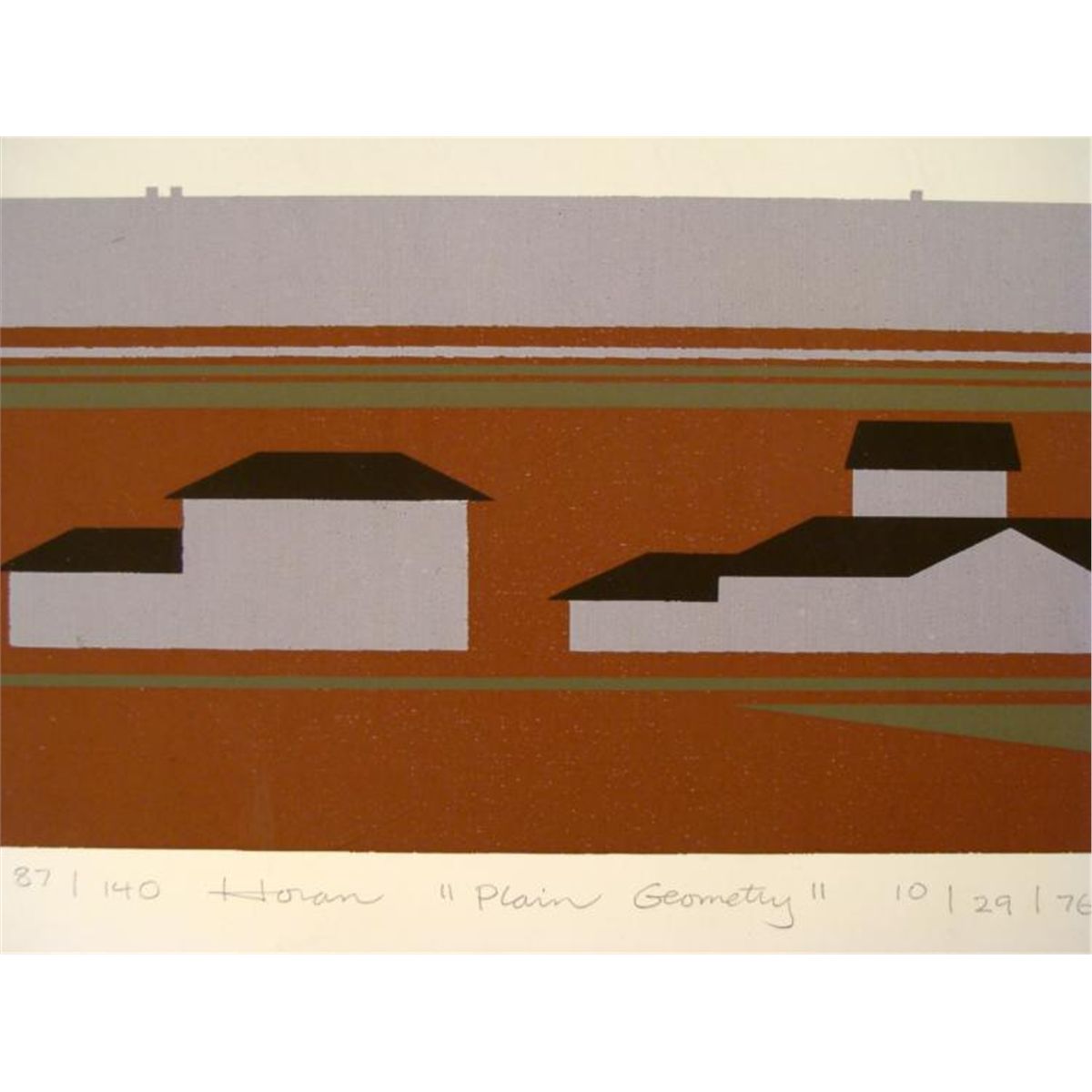 This landscape portrait is done in layers of colors and patterns, giving this rural scene a clean, Modernist style. * Artist: Steve Horan Signature: In pencil, lower left ("Horan") Title: "Plain Geometry"Edition: 87/140 Date: 10/29/76 Medium: Serigraph on paper Sheet size: 14 x 22 inches Condition: Very good; minor scuff marks overall, Biography: * Steve Horan studied Art History at the University of Chicago. Much of his artistic influence came from doing part time jobs, including card lettering, sign painting, and commercial layout. Working in acrylics or pastels, he captures basic geometric forms of landscapes, inspired by memories and discovering new ways of looking at things. Horan's art has appeared in many national exhibitions and one-man shows, as well as galleries in New York, Chicago and cities around the country. *