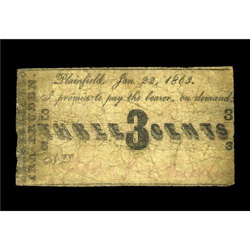 <B>Plainfield, NJ- Ira Pruden</B></I> 3¢ Jan. 22, 1863 Wait UNL<BR>A well circulated but very scarce note which is unlisted in this denomination in Wait. <B>Good-Very Good.</B></I>