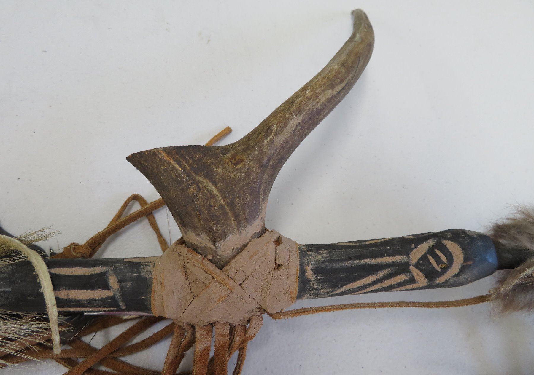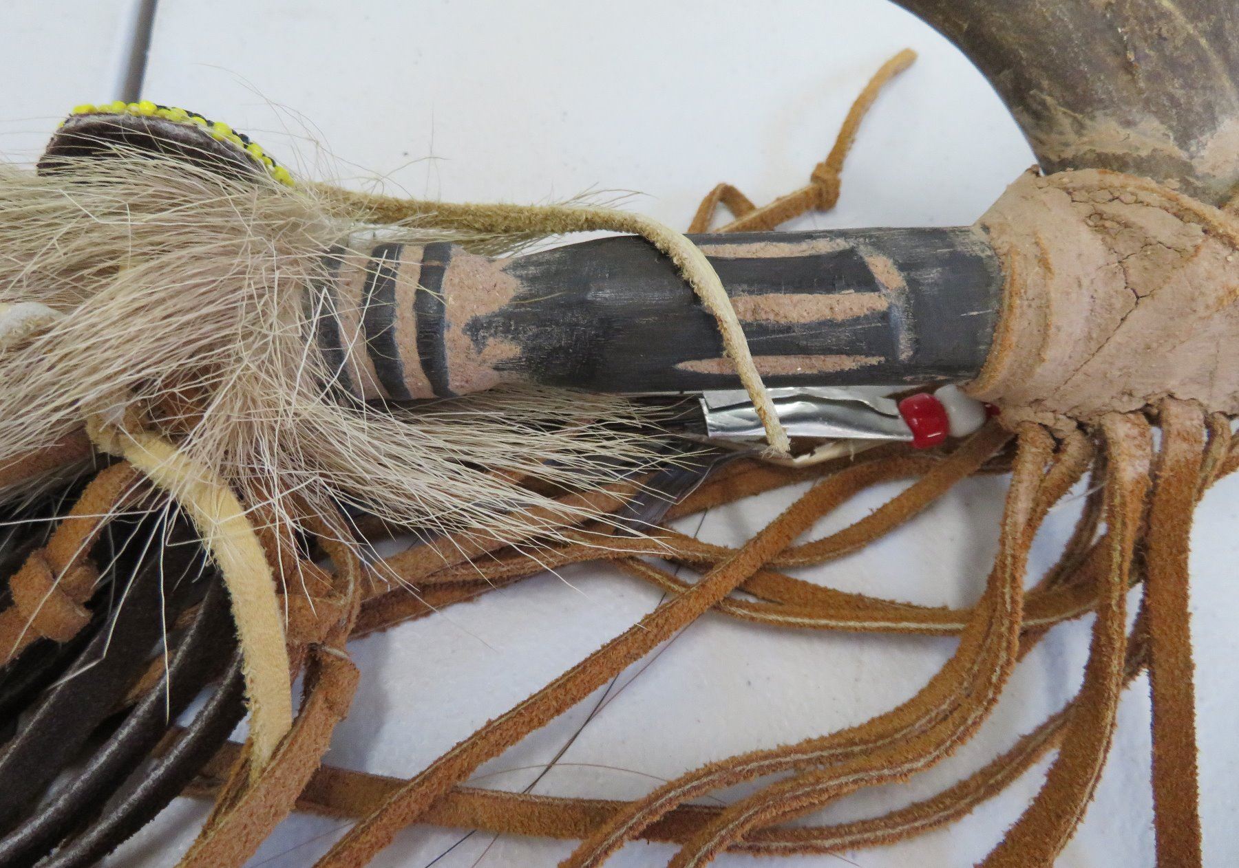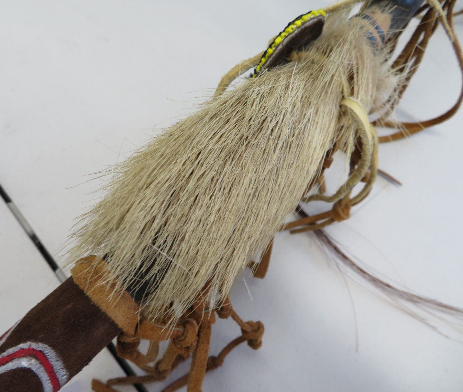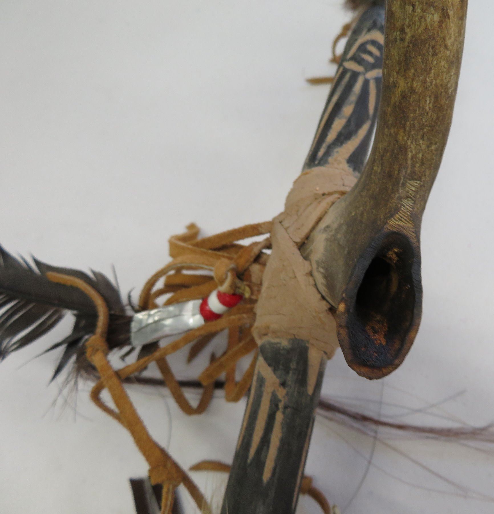 Plains Antler Pipe, 20th century item. Made of beads, hair, antler, wood, leather, paint, feathers, fin and fur, the item measures 35" x 8 1/2". Plains Indian, signed WB. Condition: Good, smoked, see images. Shipping: $55.00 USA estimate only, due to length, w/insurance and signature.