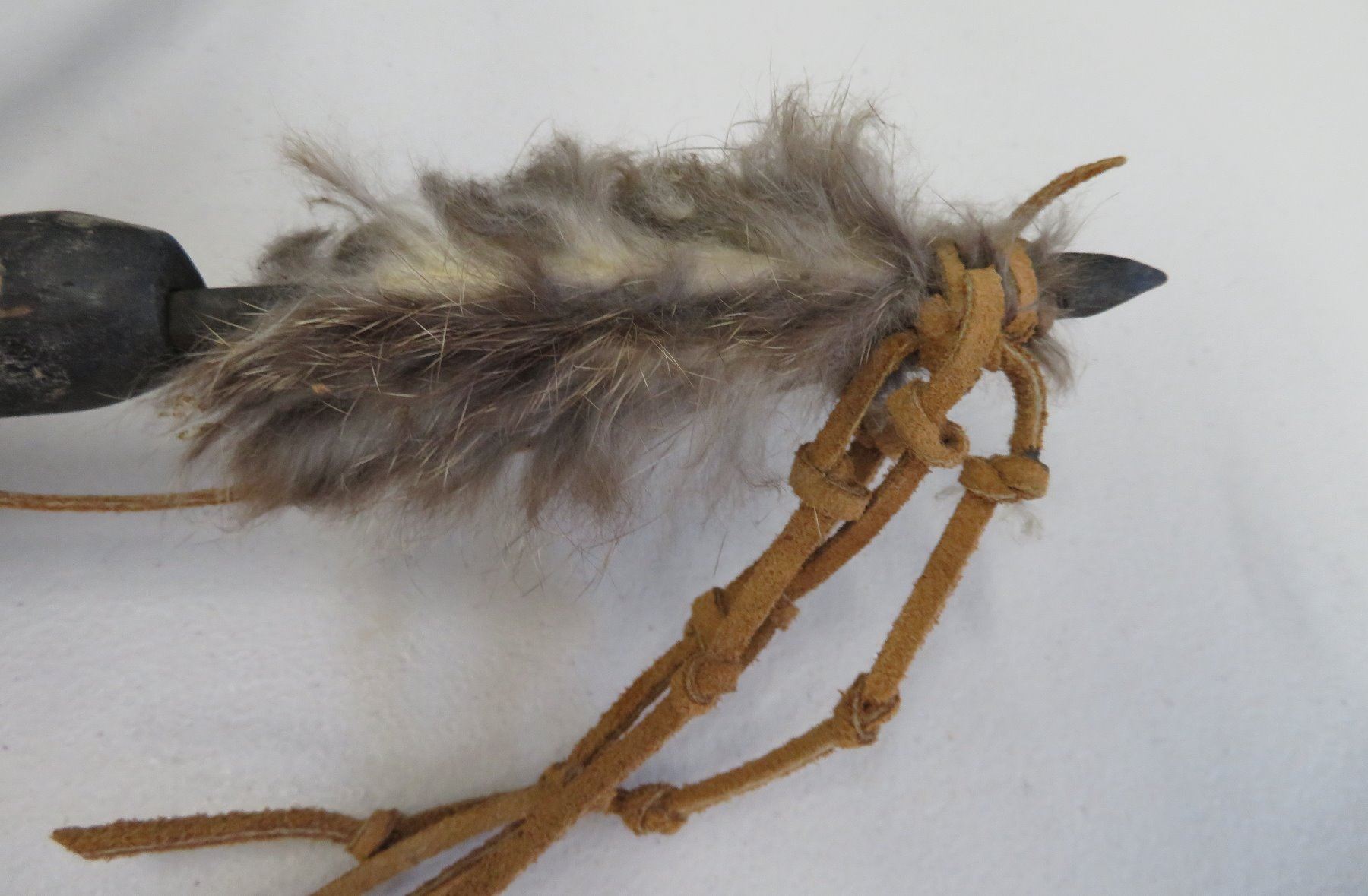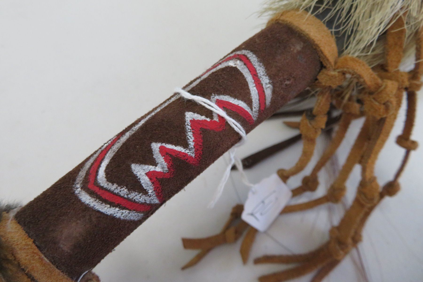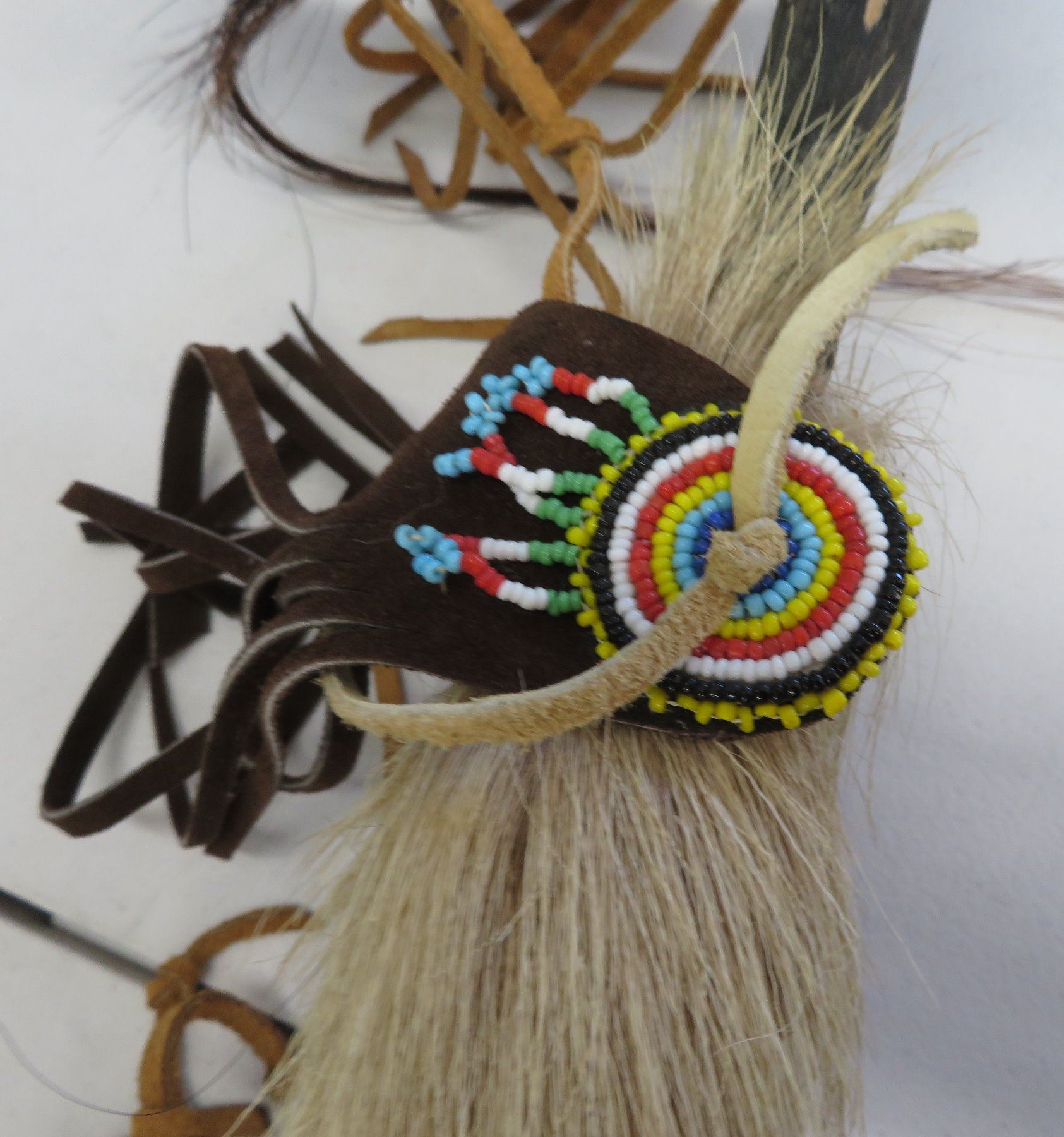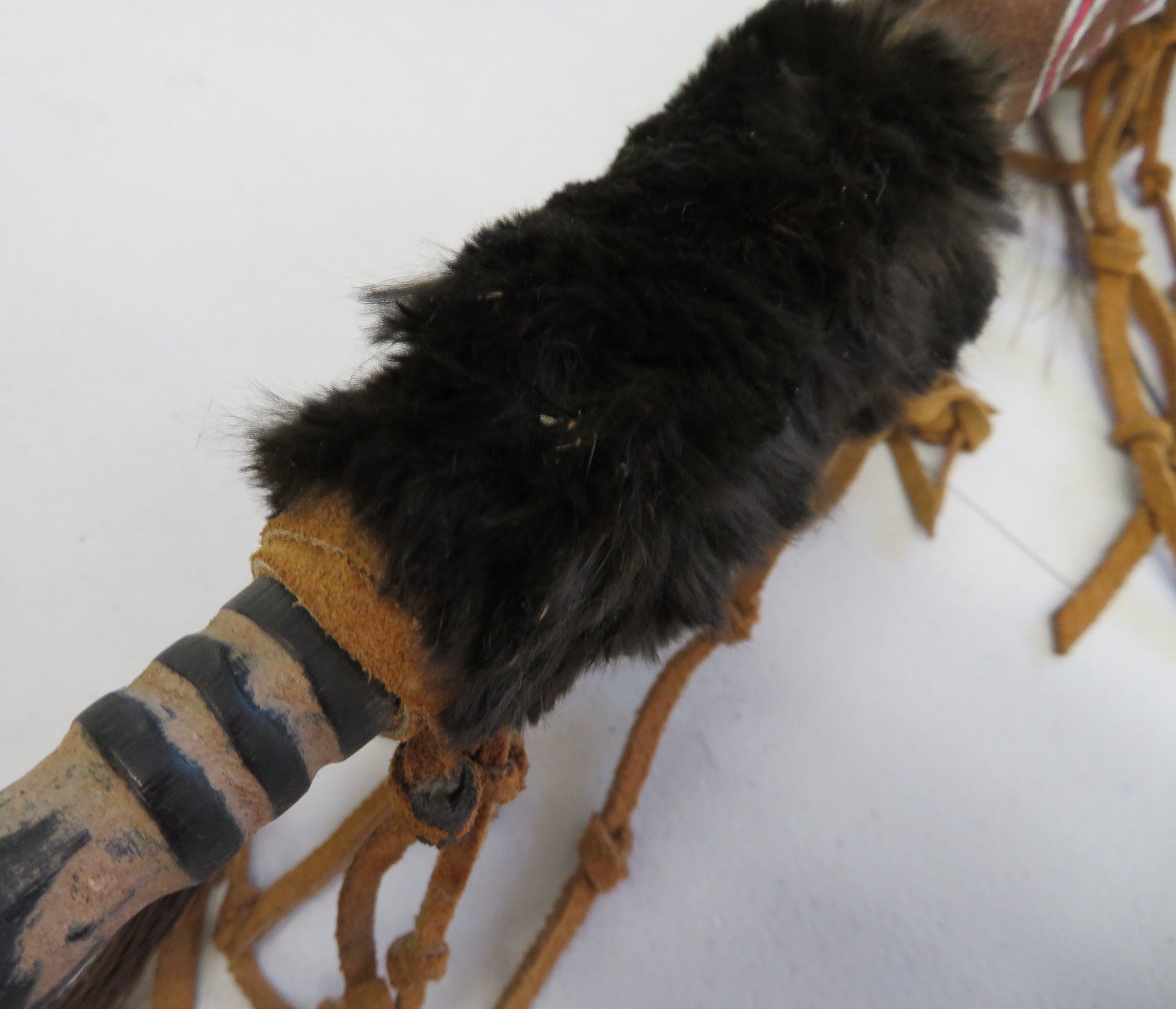 Plains Antler Pipe, 20th century item. Made of beads, hair, antler, wood, leather, paint, feathers, fin and fur, the item measures 35" x 8 1/2". Plains Indian, signed WB. Condition: Good, smoked, see images. Shipping: $55.00 USA estimate only, due to length, w/insurance and signature.