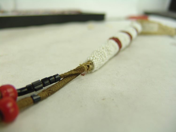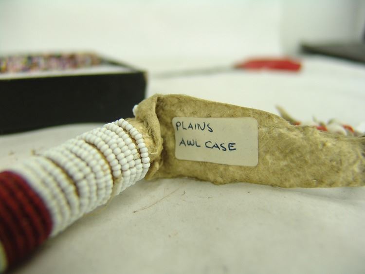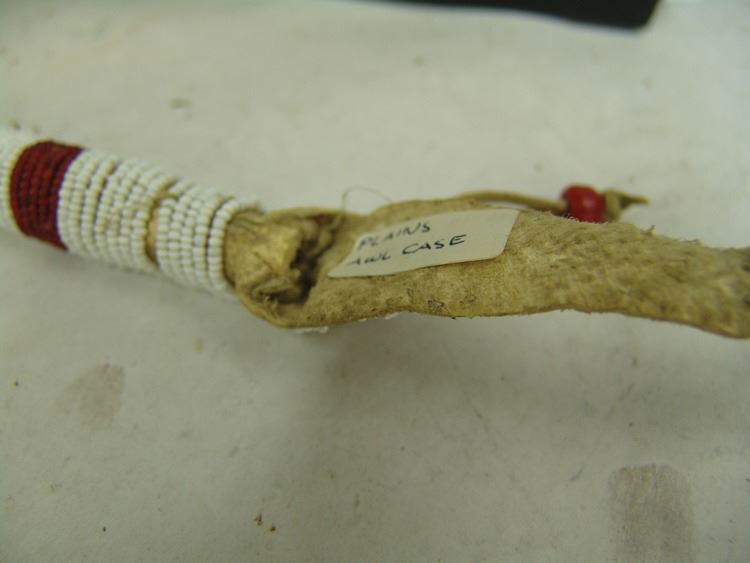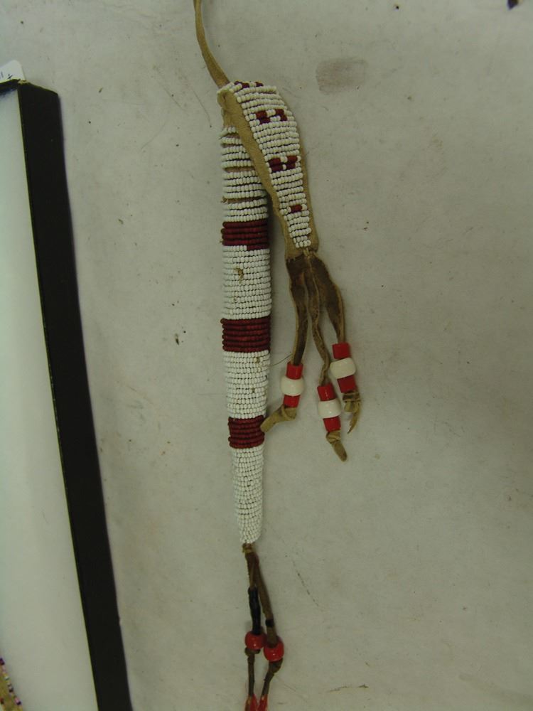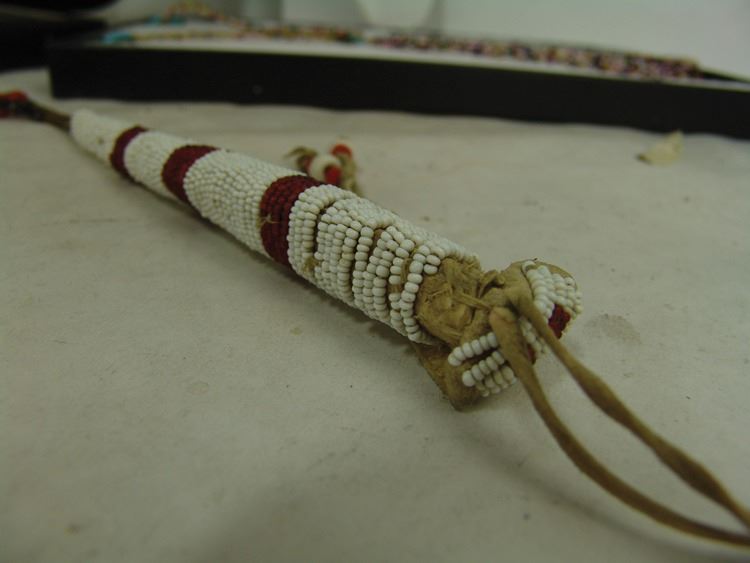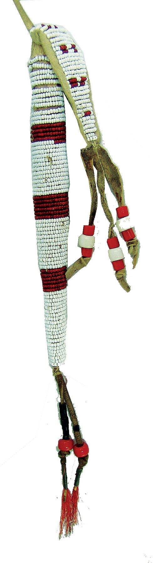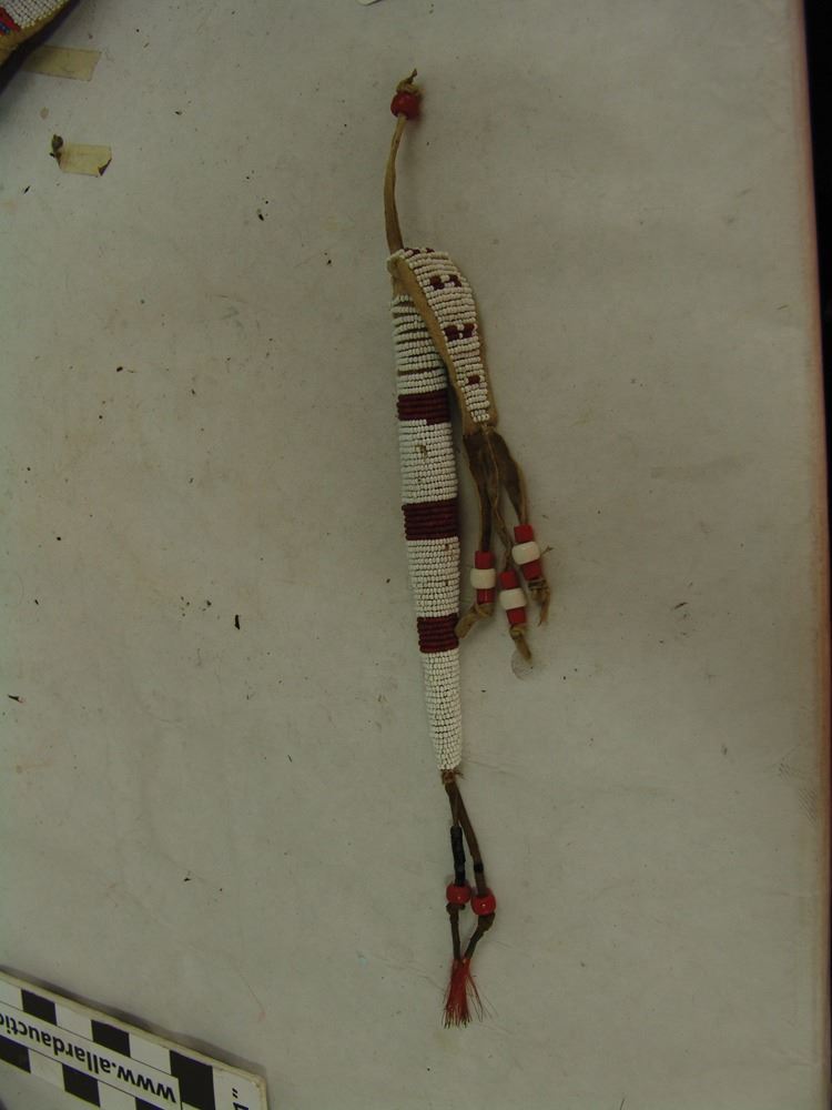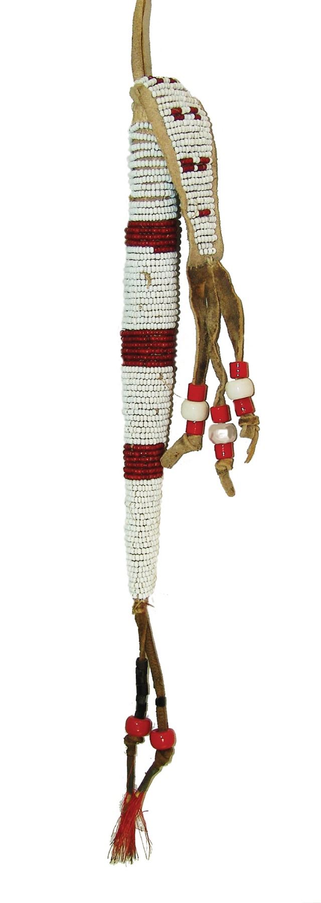 Classic shaped rawhide case with fully sinew beaded exterior and tail tab done with tiny white heart seed beads. Very good condition. Minor bead loss.,Ca. 1930s-1940s,2" x 1-3/4" (BDWK)