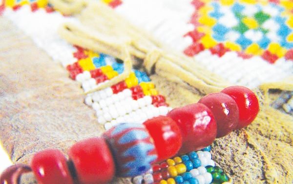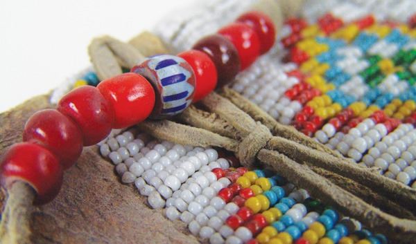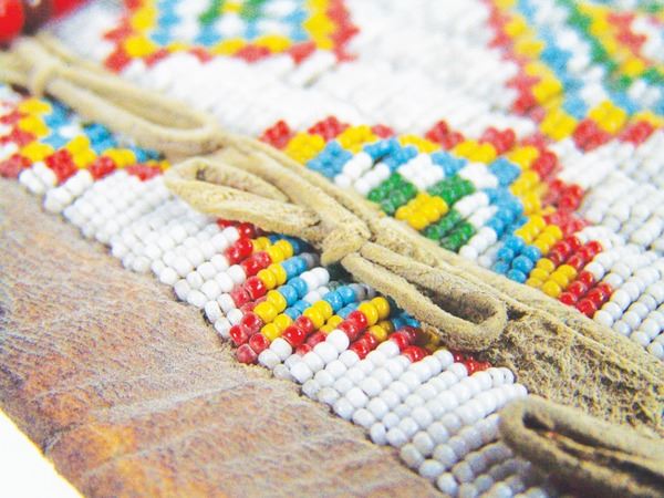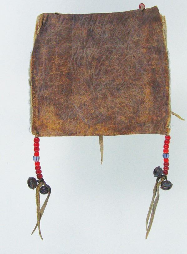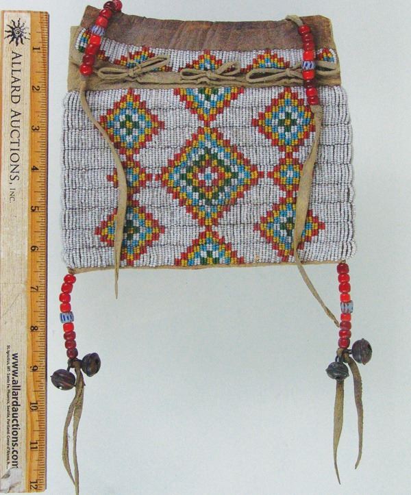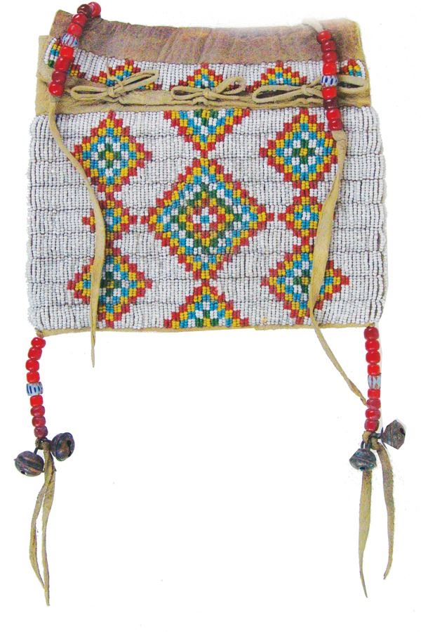 Traditional, lazy stitch beaded buckskin flap bag with leather back and colorful diamond design. Very good condition.Ca.1970s6-1/2" x 7-1/2"