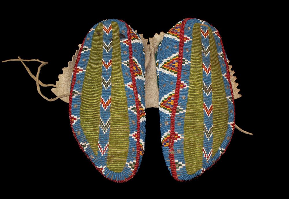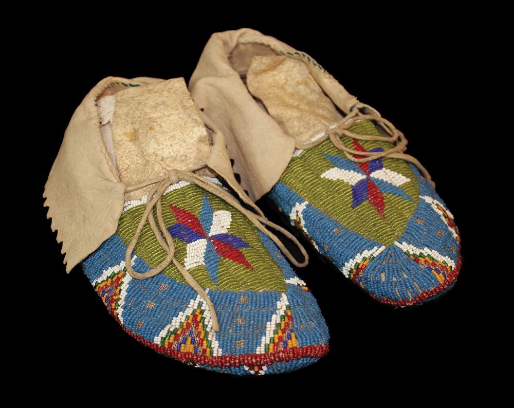 Beautiful Vaquero Star design fully beaded, turn of the century Ceremonial Moccasins. Multi-colored beaded tipis enhance the sides and vamps of these very very visual moccasins. Supple sinew sewn leather, great patina, and nice even use set off these striking Plains Indian Moccasins. Measuring 9 1/2" in length.