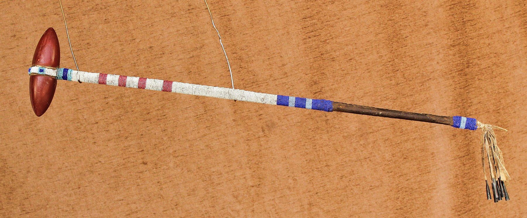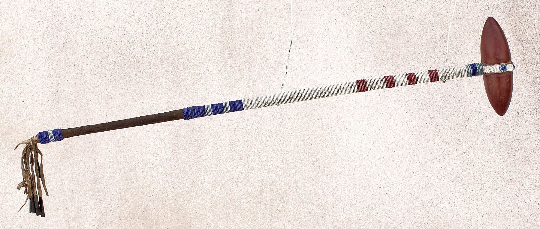 An 1890's club with bold colored catlinite head and fully beaded shaft that contains white hearts, robin egg blues, and fringed tail with tinkle cones. 25" in length.