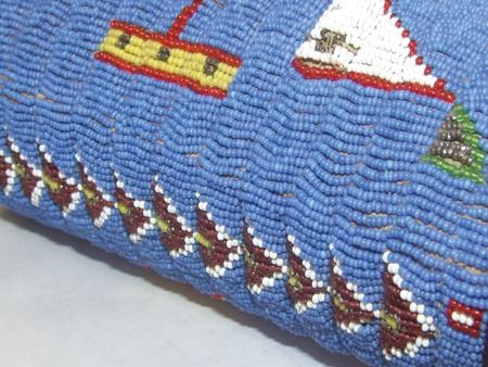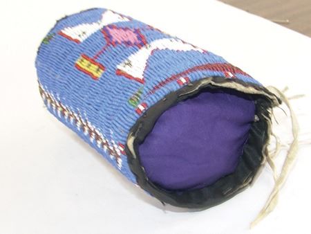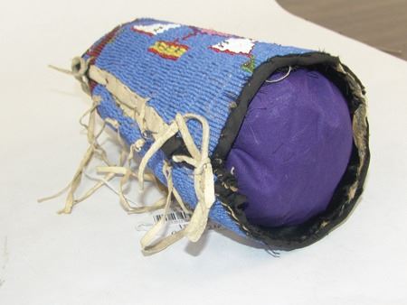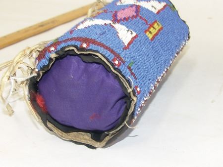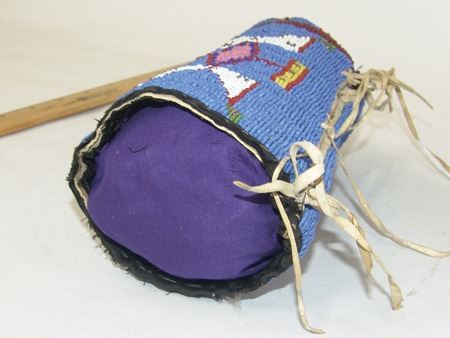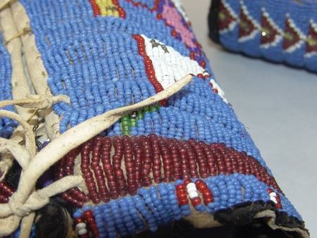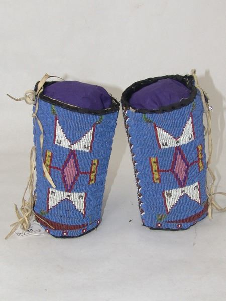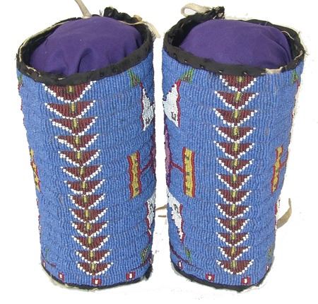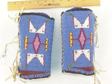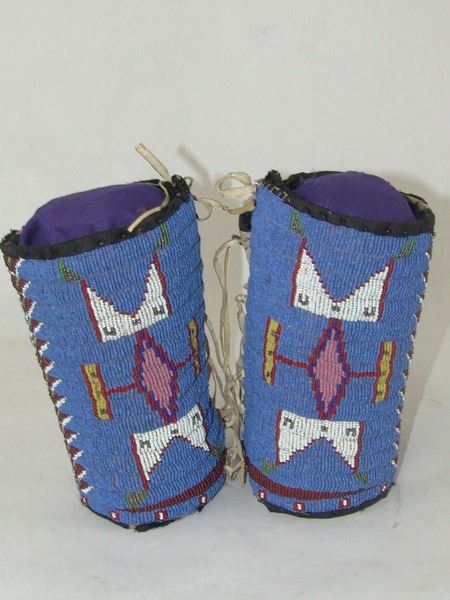Mid 1900s, Traditional pair of sinew sewn and lazy stitch beaded dance cuffs done with cloth-lined buckskin and geometric symbols. Very good condition. 7-1/2" x 6"