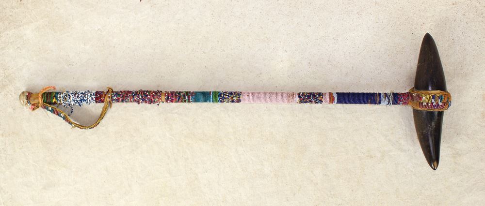 1880's Sioux ceremonial dance wand, with a 24" salt and pepper beaded haft, and a double pointed buffalo horn head. Showing terrific patina and use.