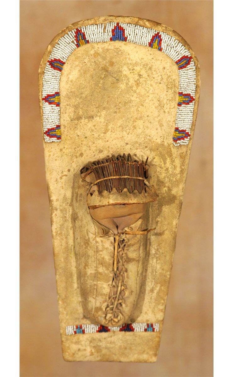 Plains Doll Cradle. 14" long x 6.5" wide at widest point. Finely beaded. No doll included. Circa 1910.