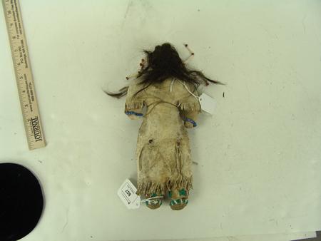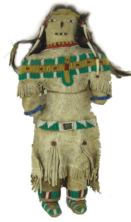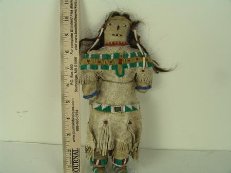 Circa Early/Mid 1900s, Beautiful female doll sinew sewn and beaded on buckskin with dress, moccasins, leggings, human hair, and dentilium drops. Very good condition. 10-1/2" tall