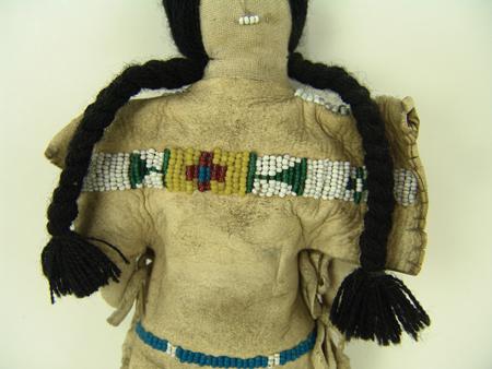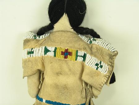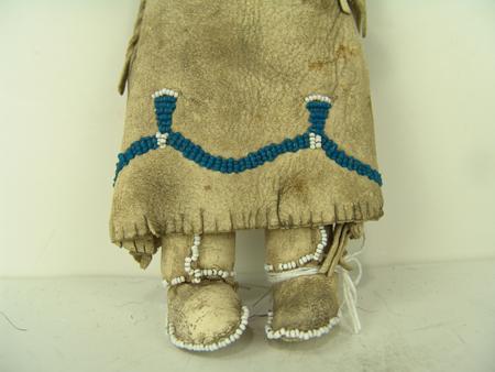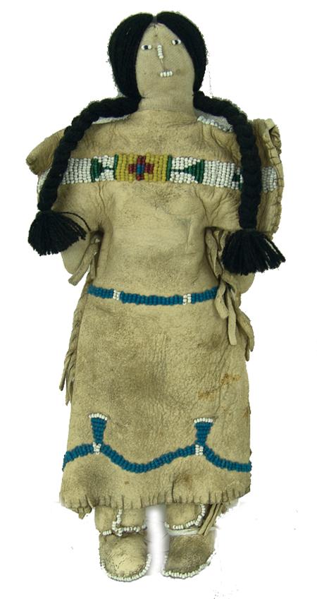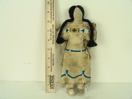Circa Mid/Late 1900s, Traditional beaded buckskin doll with dress, moccasins, leggings, thread hair, and beaded facial features. Very good condition. Ex: Huntington collection. 10" tall