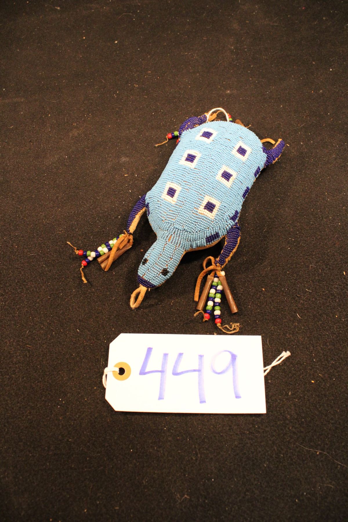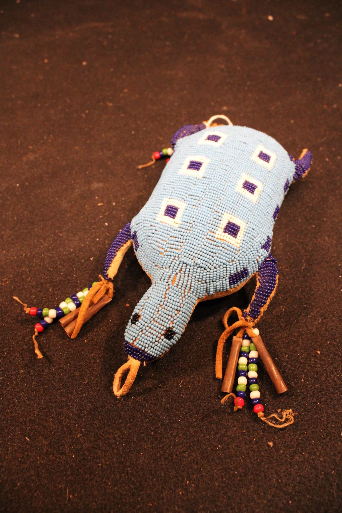 Turtle w/ blue beads. Fringe/ metal tinglets. Some fringe missing. 3" x 7"