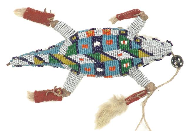 Mid 1900s, Outstanding umbilical cord amulet done in lizard form with red tradecloth feet. 7" x 3"
