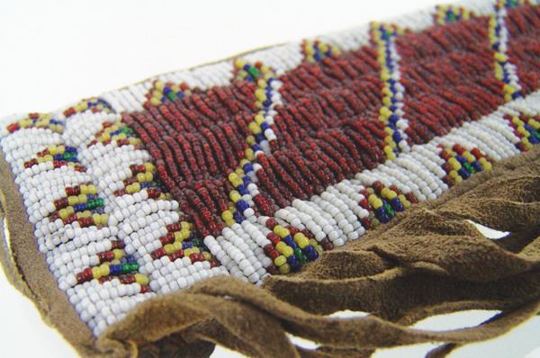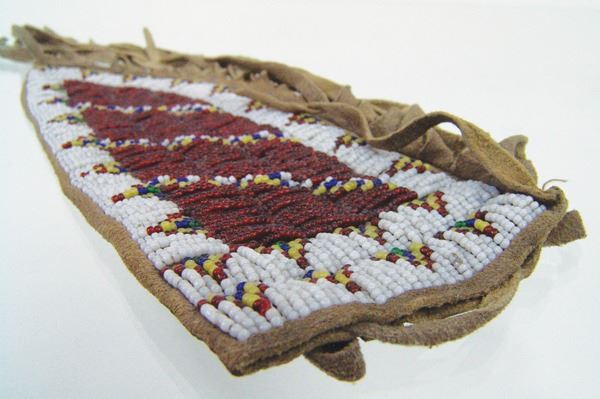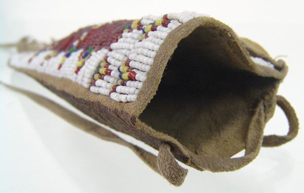 Vintage, lazy stitch beaded knife sheath with traditional geometric design and done on buckskin with leather back and fringe. Very good condition.Mid 1900s9"