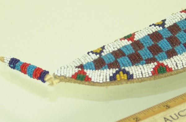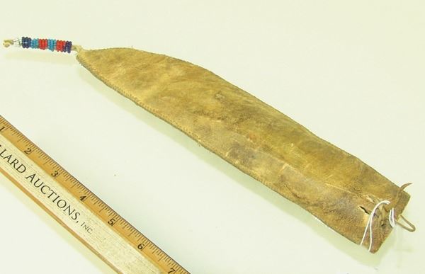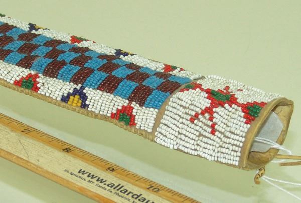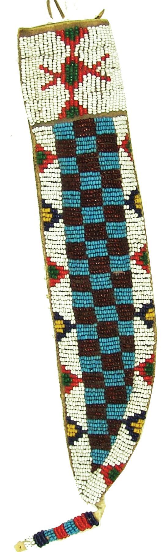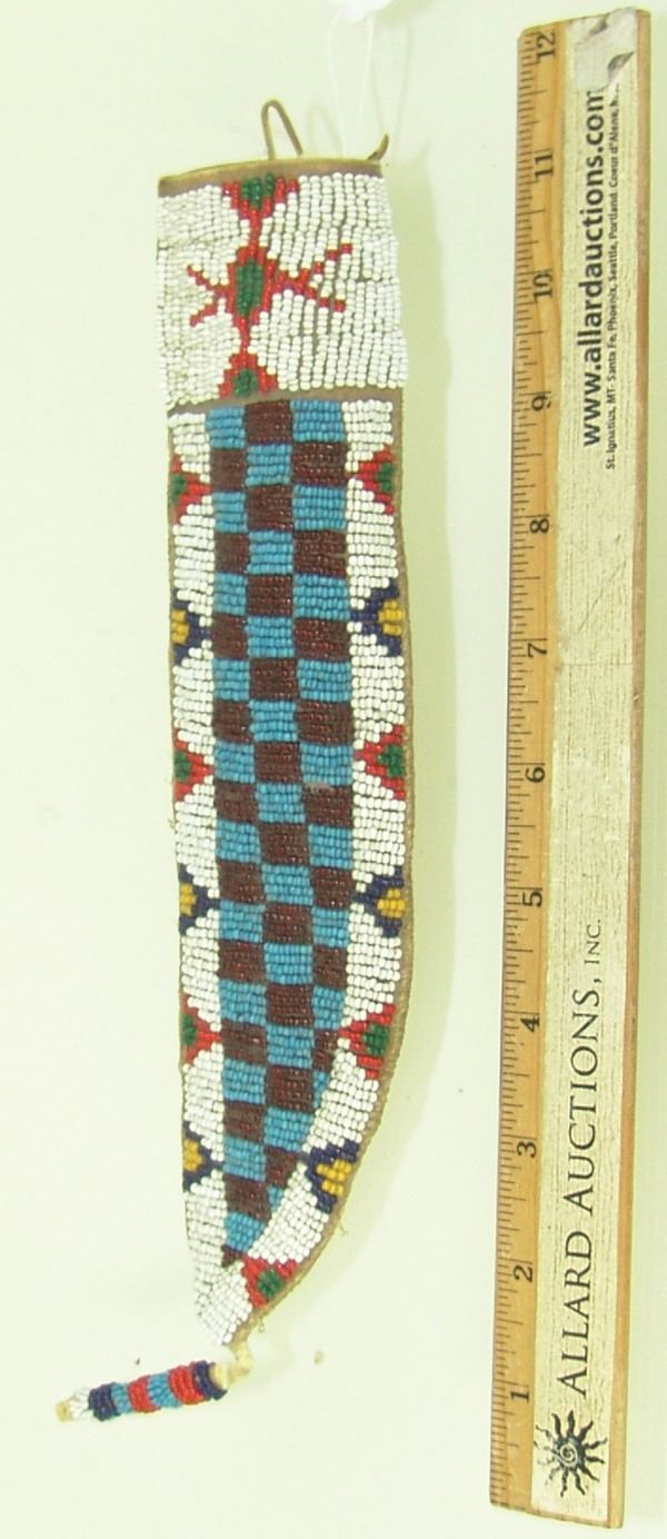 Long, sinew sewn and lazy stitch beaded, shaped rawhide knife case with checkered body design. Very good condition.Early/Mid 1900s10"