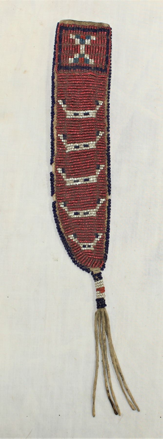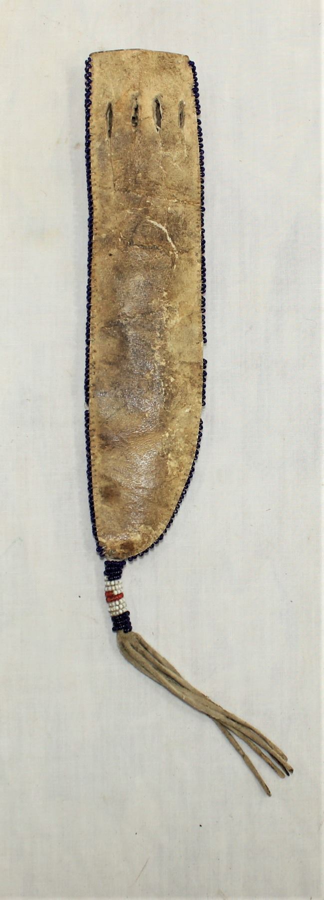 Stylish early full coverage beaded knife sheath with cobalt blue and white beads on a red white heart background, and adorned with a beaded drop.