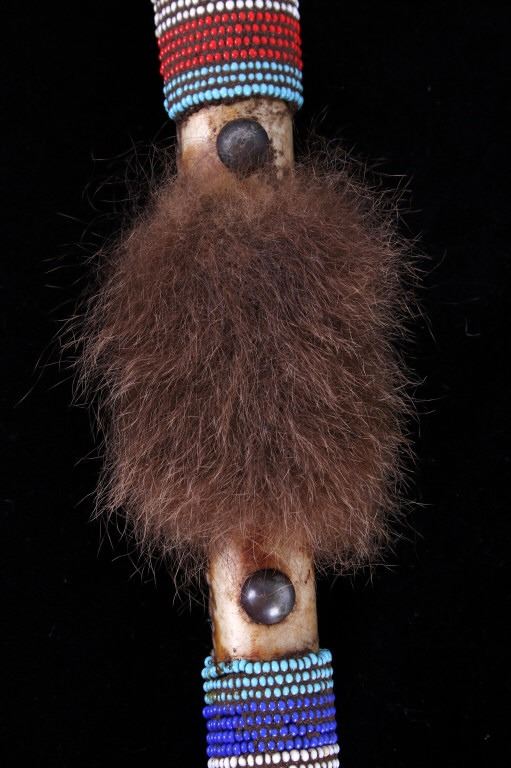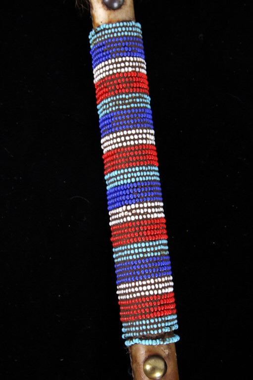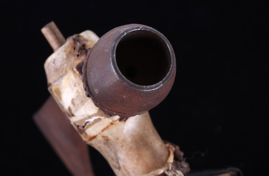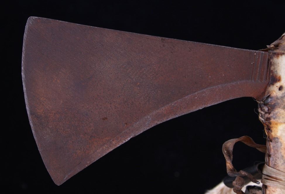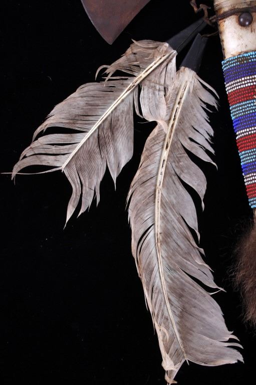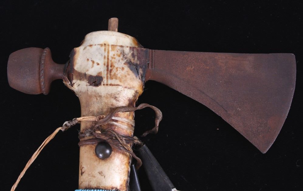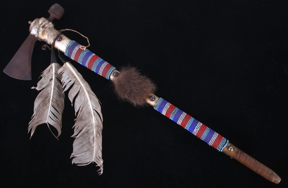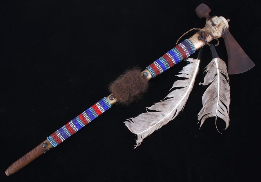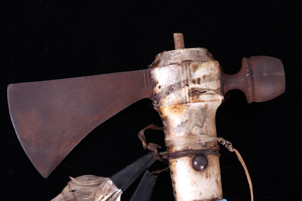 Featured in this lot is this Plains Indians beaded Parfleche wrapped pipe tomahawk circa late 20th century. This pipe tomahawk features a wonderfully and professionally crafted tiger maple and Parfleche wrapped construction that features iron tack decoration and is beaded with trade seed beads with coloration of sky blue, medium red, medium blue, and chalk white. The feathers adorning the head are colored turkey feathers . The axe head is cast as is the pipe on the other end of the head and features a Parfleche wrapped construction. The condition of this pipe tomahawk is good with oxidation adorning the blade and the pipe but otherwise is in good overall condition. The measurements of this pipe tomahawk are 22 3/4" x 7 1/8" x 1 1/4".
