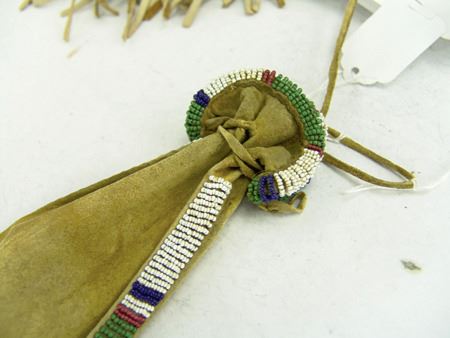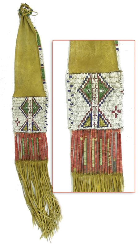 Late 1800s, Rare narrower design two-sided sinew sewn and lazy stitch beaded pipe bag done on ochred antelope hide and with quilled slats and long fringe. Very good condition. Ex. Doug Allard Collection. Purchased in 1999 for $2750 in Santa Fe. 32" (including fringe) x 5"