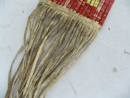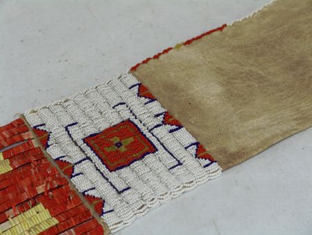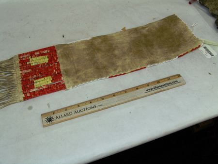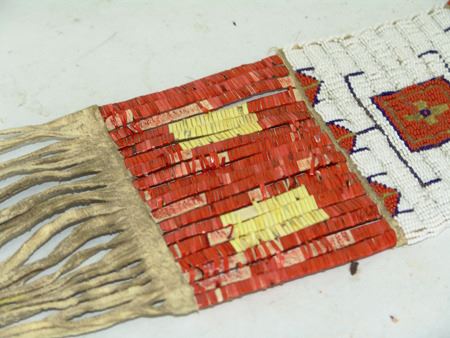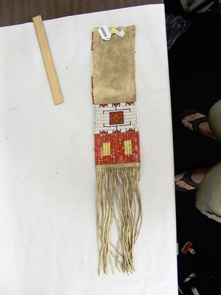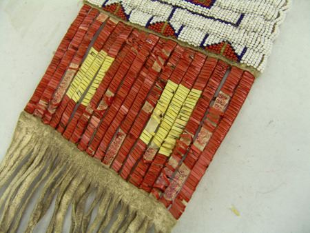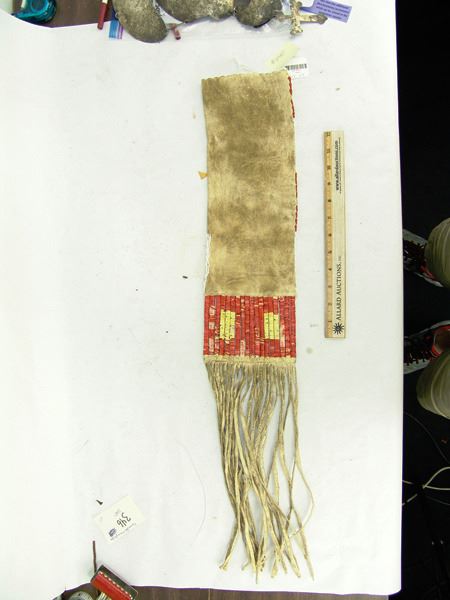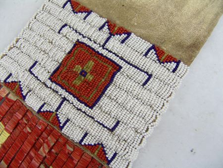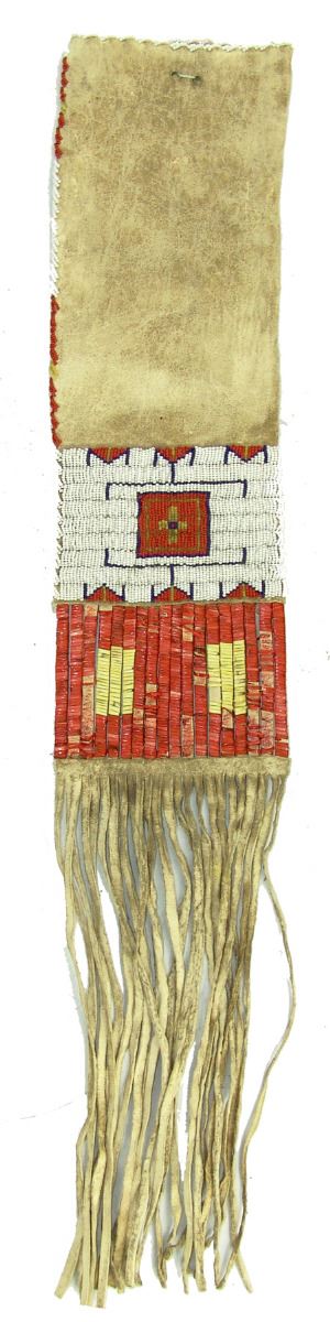 Mid 1900s, Traditional sinew sewn and lazy stitch beaded buckskin pipe bag with unique cross-in-box design on front, quilled slat suspensions, and long fringe. Very good condition. 31" (including fringe) x 5-1/2"