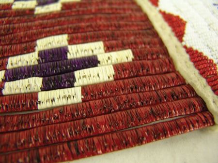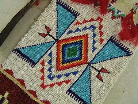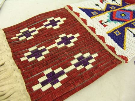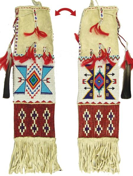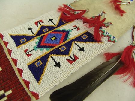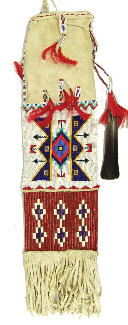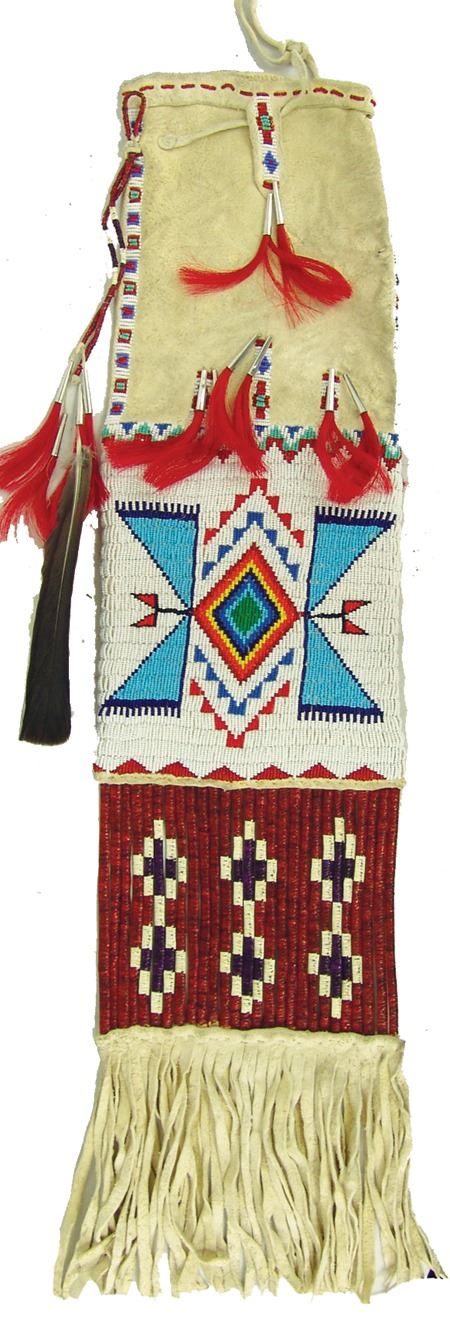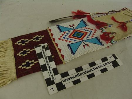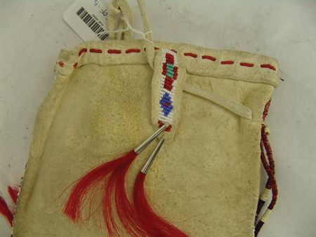 Mid/Late 1900s, Beautiful white elk hide pipe/tobacco bag with traditional two-sided sinew sewn lazy stitch bead designs, deep ruby red quilled and tin cone/horsehair suspensions, and long fringe. Excellent condition. 19' plus fringe