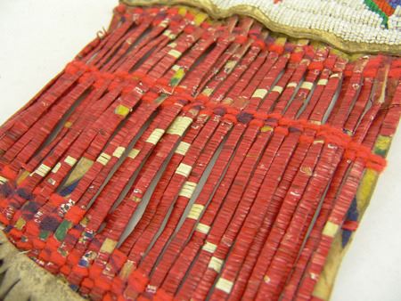 Late 1900s, Classic sinew sewn and lazy stitch beaded buckskin bag with two-sided geometric design and with quilled slats made from an earlier section of a painted parfleche. Good condition overall. 31" (+ fringe) x 7"