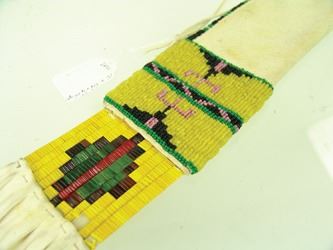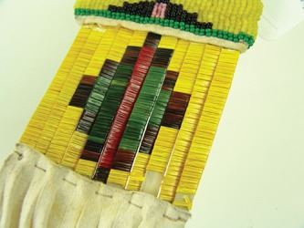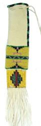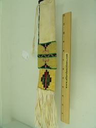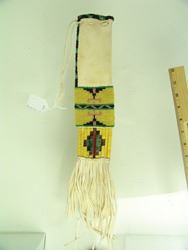 Fine, miniature, two-sided pipe bag with lazy stitch beaded panel, quilled slat suspensions, long fringe, and drawstring top, all done in yellows and blackberry colors. Very good condition. Mid/Late 1900s. 12" + fringe.